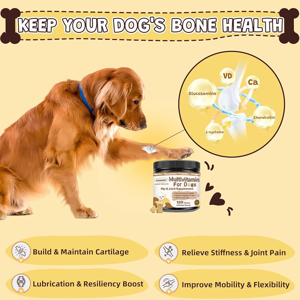 فيتامينات متعددة للكلاب مع معادن للصحة العامة - فيتامينات ومكملات للكلاب مع الجلوكوزامين والبروبيوتيك للكلاب الكبيرة وكبار السن مع المعادن - زيت السمك أوميغا 3 للبشرة والمعطف - 116 قطعة مضغ