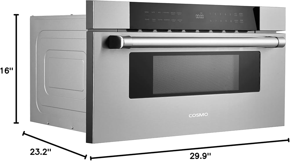 Maximize your kitchen space with the seamless integration of the Cosmo COS-MWD3012NHSS Microwave Drawer into your cabinetry. This top loading microwave drawer provides a clutter-free countertop with its built-in installation. The 30 in. construction fits into wider cabinets while also accommodating larger dishes when cooking. Elevate your culinary experience with 10 power levels and 1000 watts of cooking power, ensuring meals are a flavorful success. Easily open and close the microwave with the touch of a button on the easily accessible control panel. Effortlessly heat meals with automatic presets including melt, soften, popcorn and beverage. Thawing food is a cinch with the weight or time defrost options, and the included defrosting rack allows you to maximize the microwave's capacity. This microwave is built with safety in mind, providing a child lock function. The sleek stainless steel build fits perfectly into any modern kitchen design.
