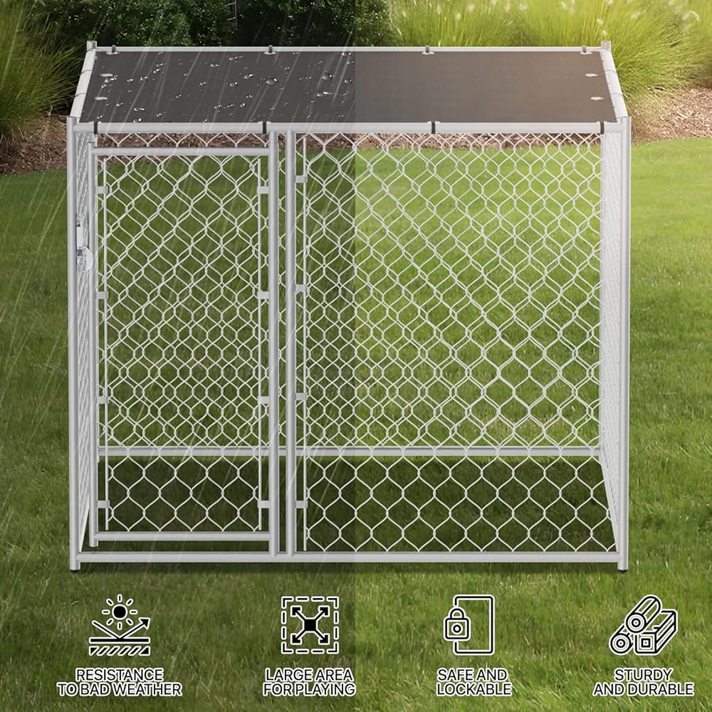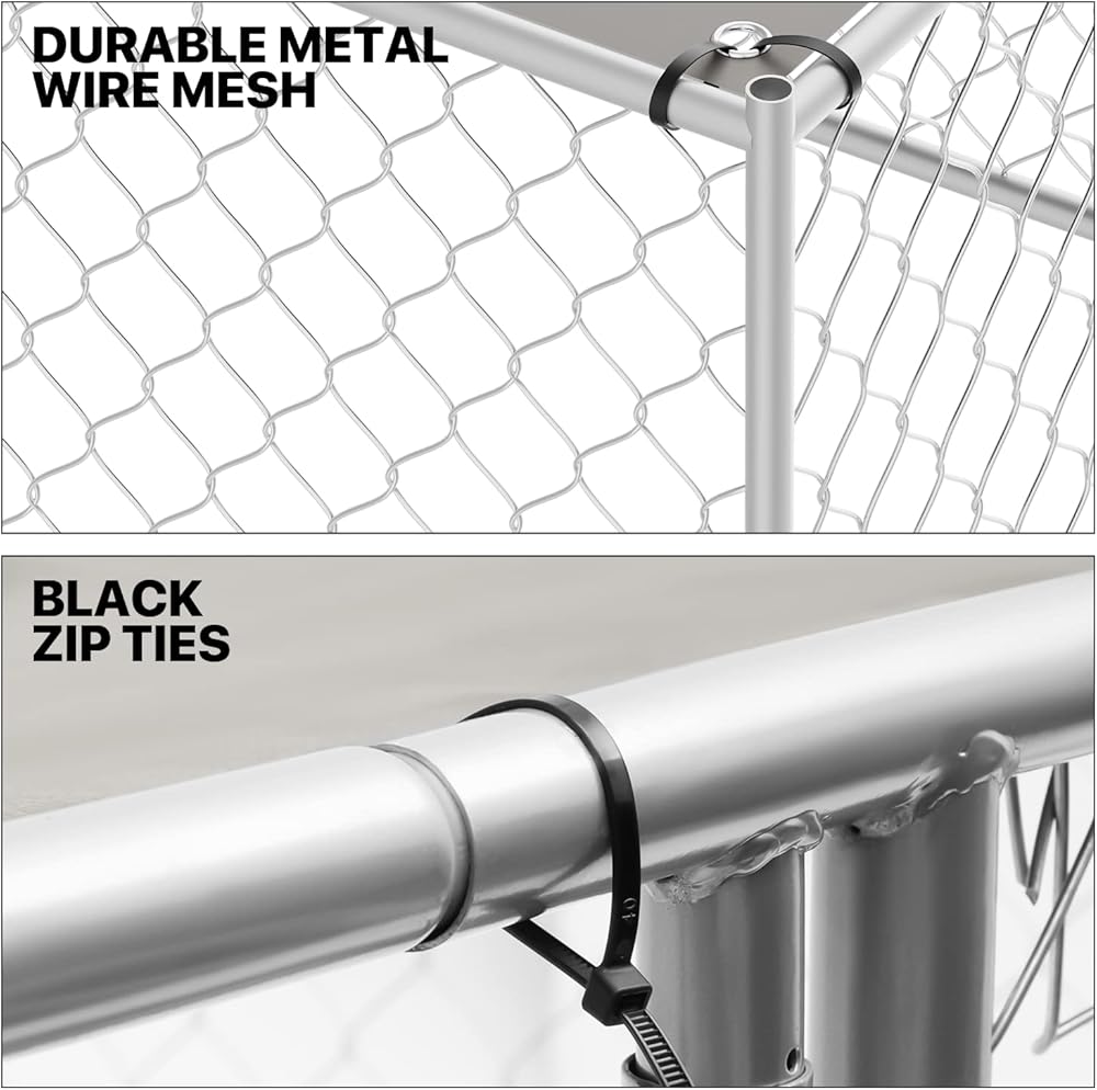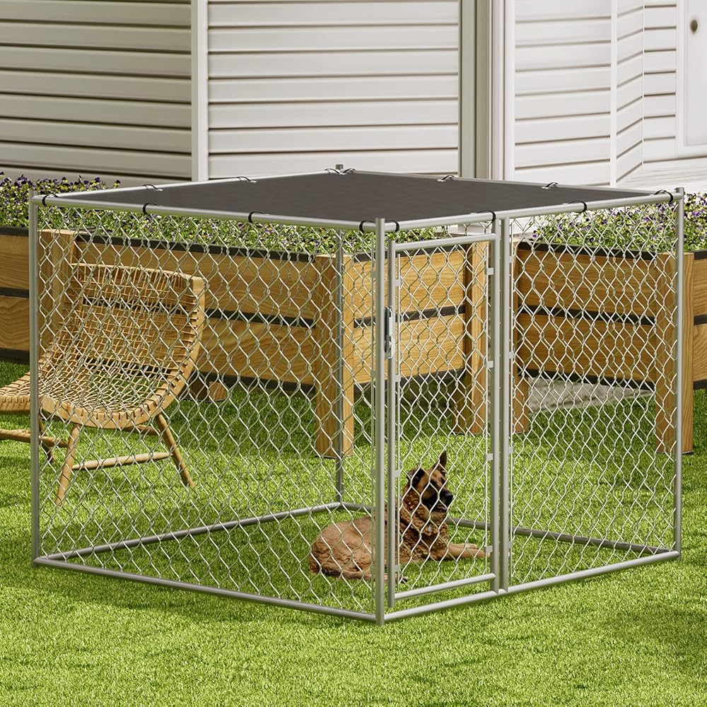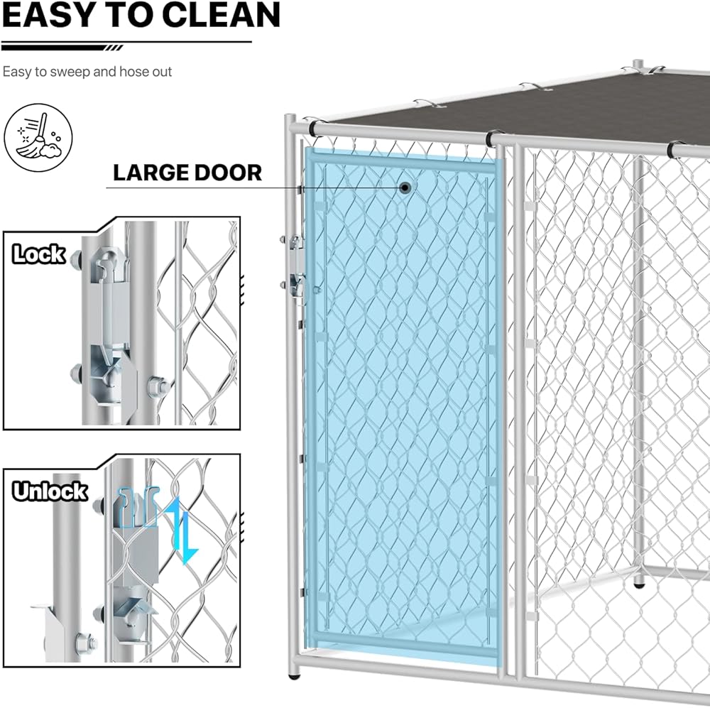مادة ممتازة - بيت الكلاب ذو سلسلة ربط مصنوع من وصلة سلسلة مجلفنة وإطار فولاذي متين مطلي بمسحوق. يتم لحام زوايا الإطار قبل الطلاء لمنع الحواف الحادة وتوفير حماية أكبر ضد الصدأ والتآكل.