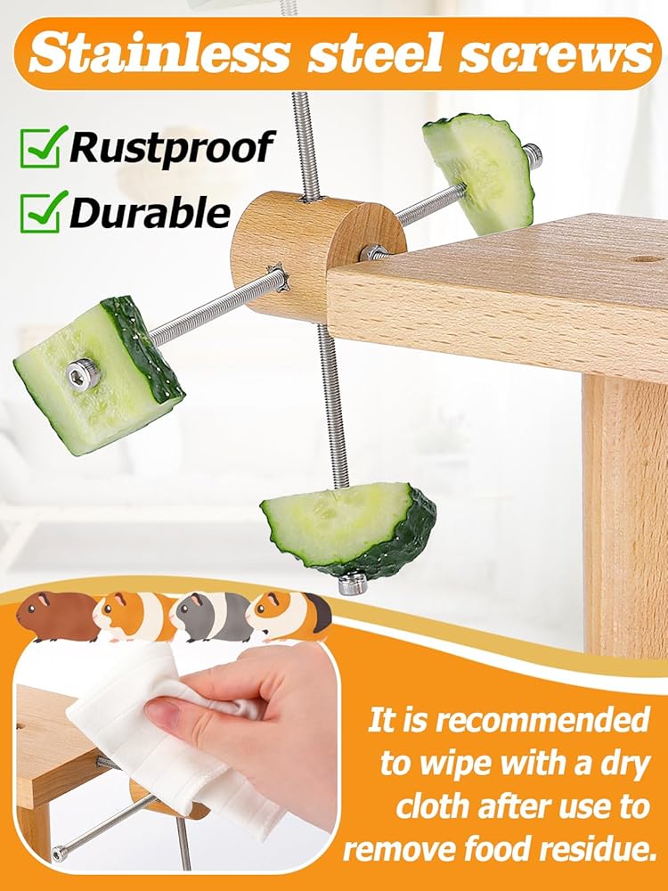 Easy to Use: Simply place your guinea pig's favorite food (e.g., carrots, cucumbers, apples) on the stainless steel holder. The included nut accessory allows you to adjust the tightness and rotate it as needed. Warm tips: please wipe with a dry cloth after use to remove food residue.