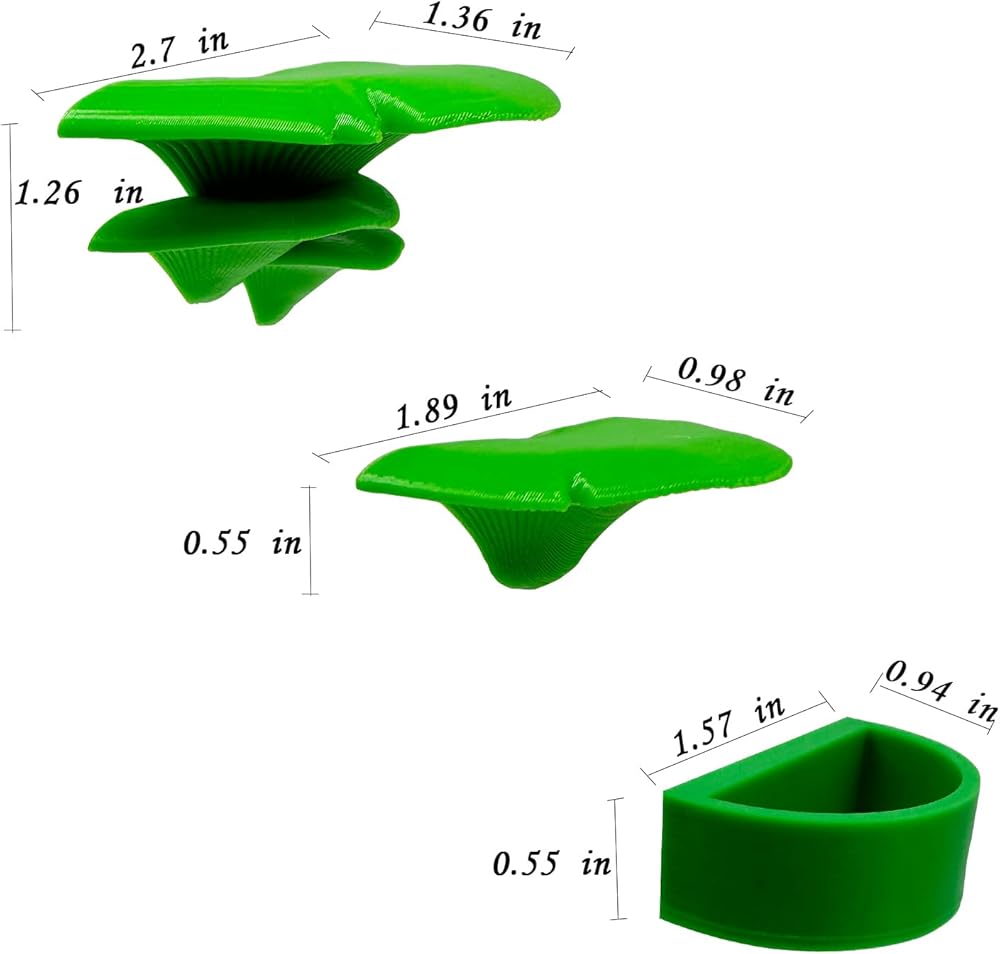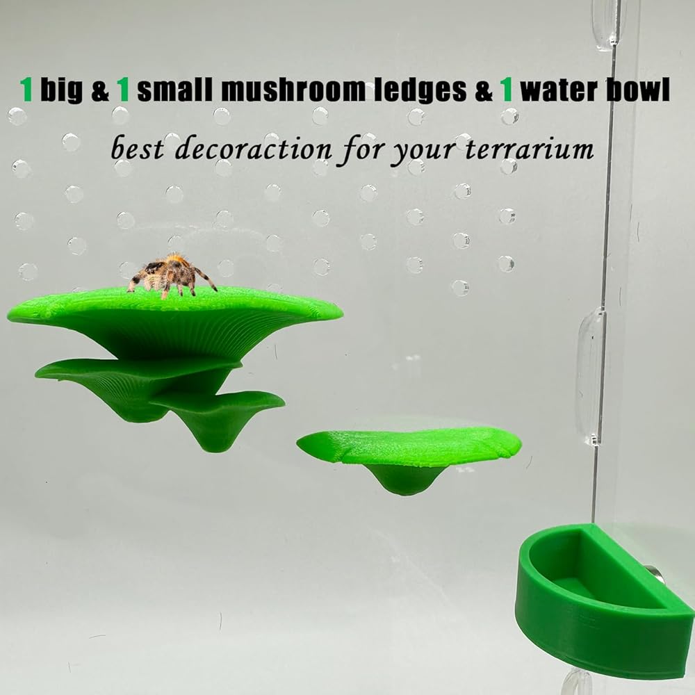 Every package include one big and one small mushroom ledges and one water bowl, suitable for adult and baby jumping spider. *Note: Due to the mutual attraction between the magnets, they may dislodge from the ledges or dish. A gentle press is all that is required to reinsert them.*