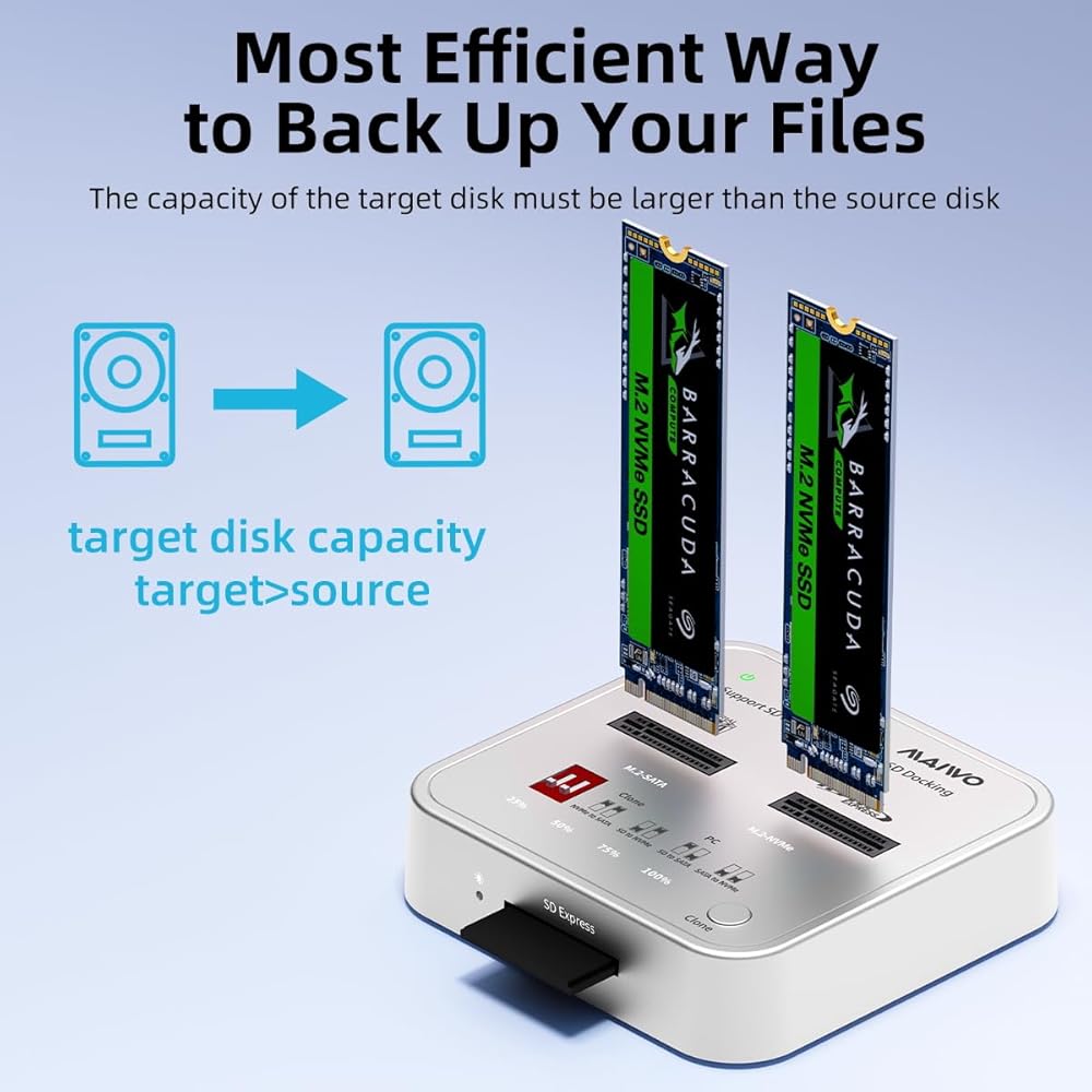 【سعة 8 تيرابايت】يدعم جهاز النسخ المزدوج M.2 توسيع 2 تيرابايت مع كل فتحة M.2، ويدعم توسيع 4 تيرابايت مع فتحة بطاقة SD. سعة 8 تيرابايت إجمالاً