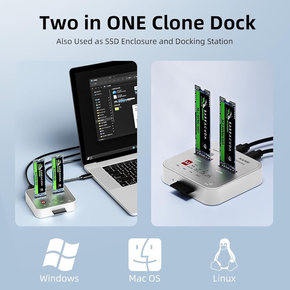 【استنساخ متعدد الاستخدامات】يسمح هذا الجهاز بالاستنساخ والنسخ السلس لمحركات أقراص M.2 NVMe وSATA SSD، مما يتيح نقل البيانات والنسخ الاحتياطي بكفاءة. وهو يدعم القراءة والكتابة لكل من محركات أقراص NVMe وSATA SSD في وقت واحد، واستنساخ بعضها البعض دون الحاجة إلى جهاز كمبيوتر. متوافق مع NVMe M-key/B&M Key / SATA B-Key، ويدعم قراءة بطاقة SD للإصدار 7.1 والإصدار الخلفي