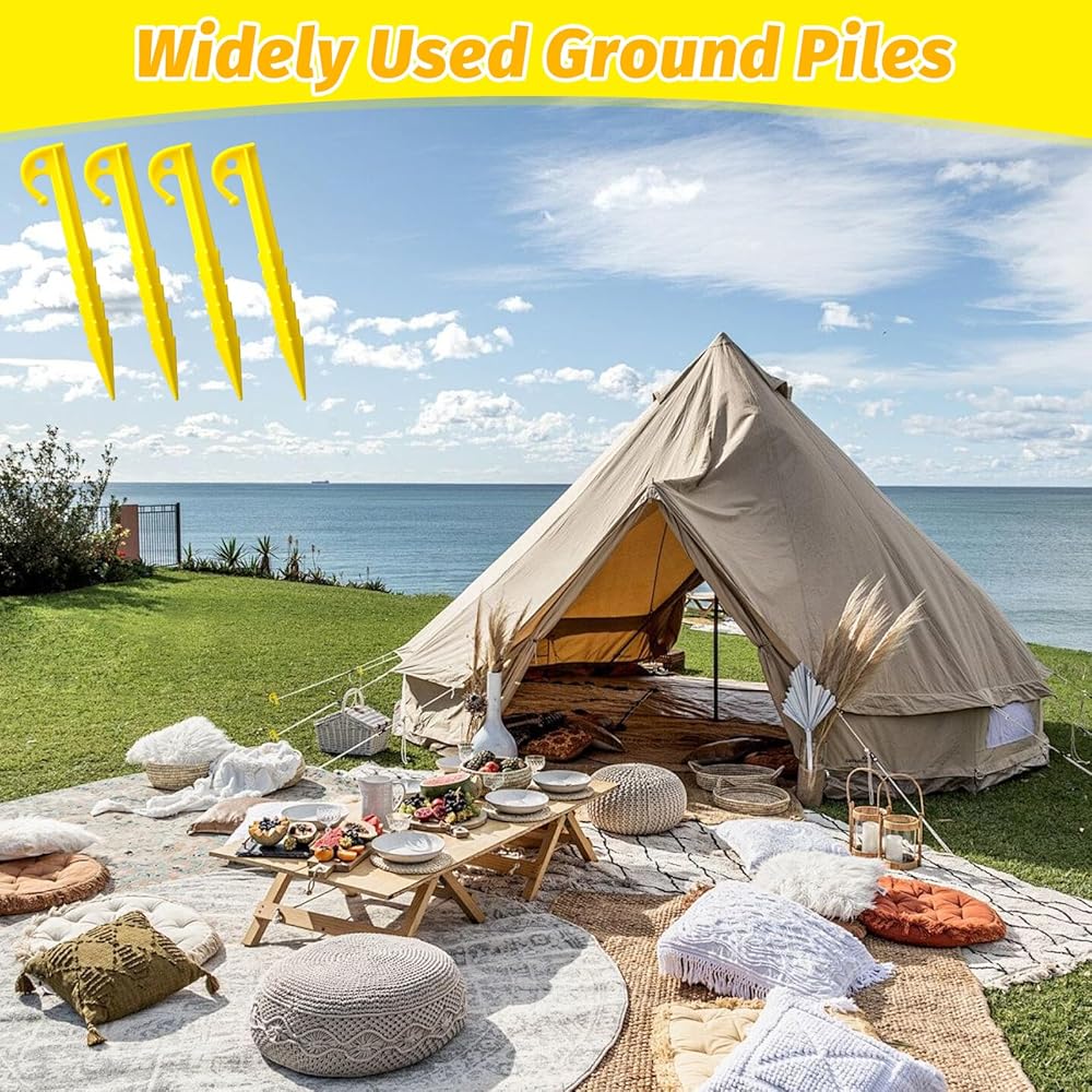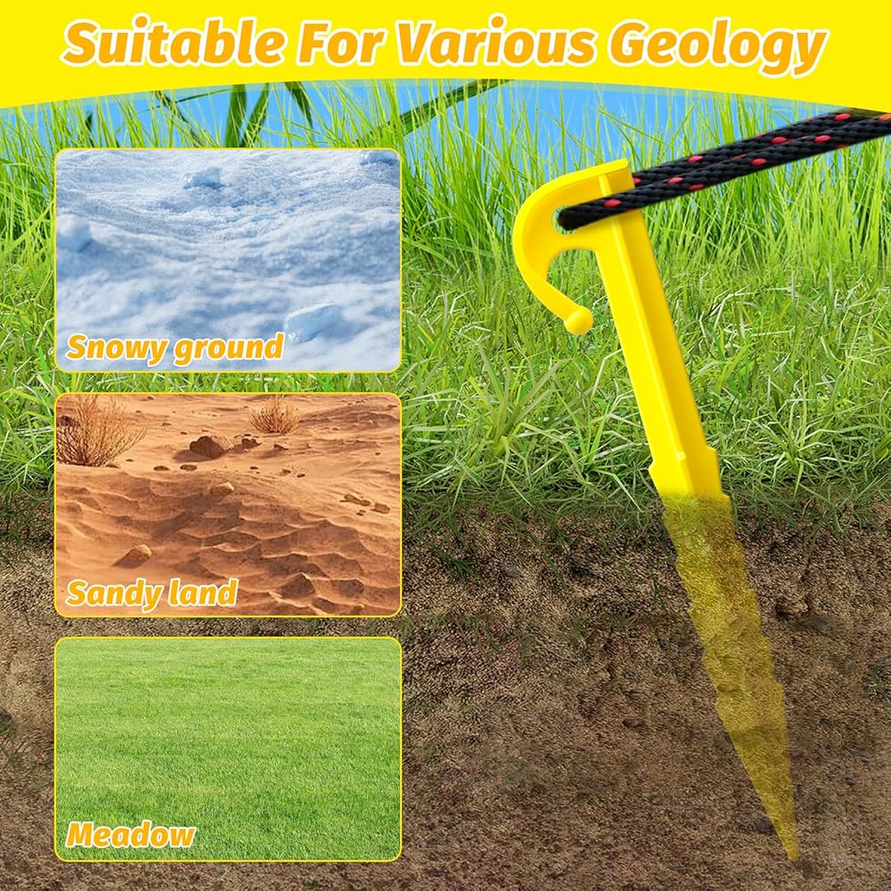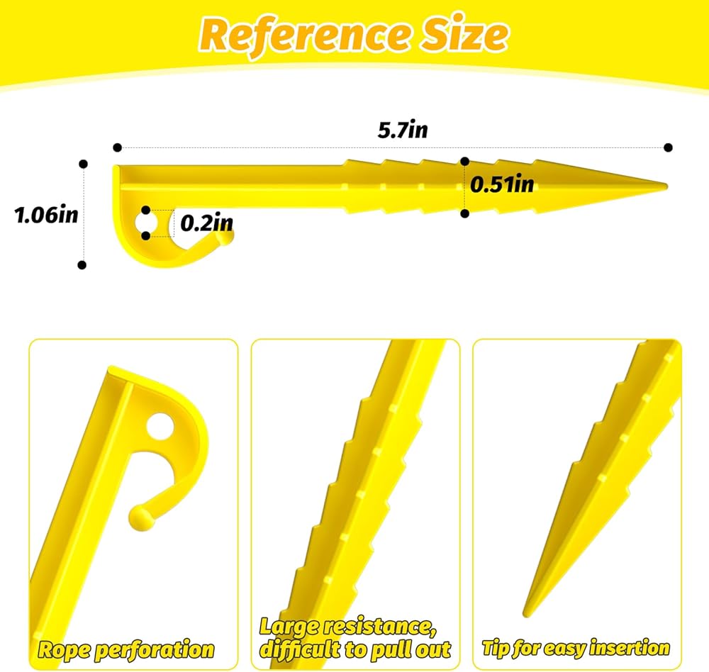 【استخدام واسع】يمكن استخدام أوتاد الخيمة البلاستيكية لدينا لمجموعة متنوعة من الأغراض، مثل الخيام والمظلات والأراجيح وحتى زينة عيد الميلاد القابلة للنفخ، مما يوفر لك الكثير من الراحة لمغامرتك الخارجية القادمة.