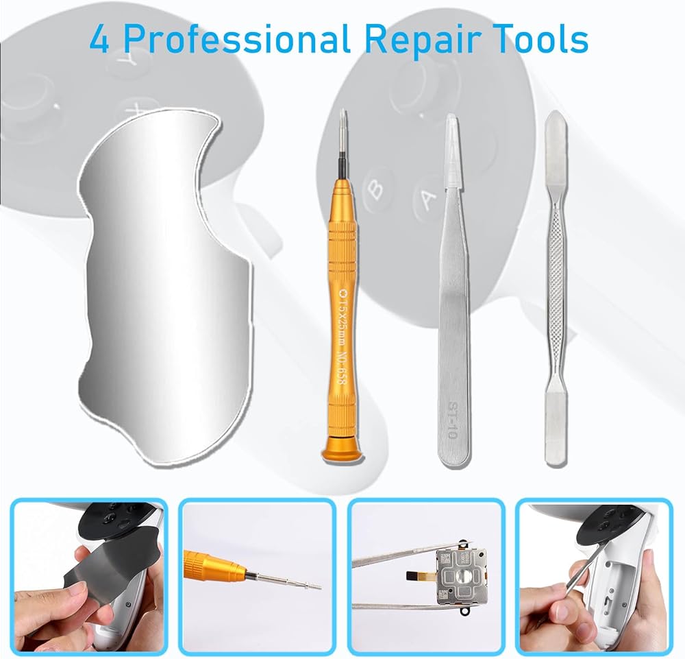 【T5 Screwdriver, Tweezer, Pry Tool, Pad tool + 】-- A high quality metal T5 screwdriver ensures no slippage. Tweezer, Pry Tool, Pad tool are also included in the repair kit. Helps to disassemble and install more convenient. (Note:Replacing the joystick requires professional installation skills. After replacing the joystick for Oculus Quest 3 , if it show the problem of drifting not center, it means it will need to manual calibrate.) (for cell phone repair kits)