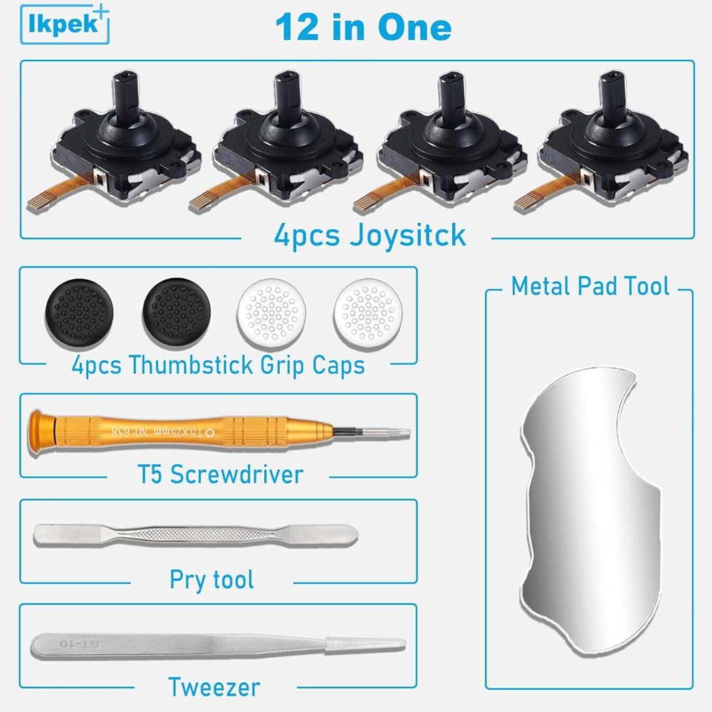 【What you get】Complete Repair Kit -- 4 x joystick, 4 x ThumbStick Cap, 1 x Metal T5 Screwdriver, 1 x Metal tweezer, 1 x Metal Pry Tool, 1 x Metal pad tool.