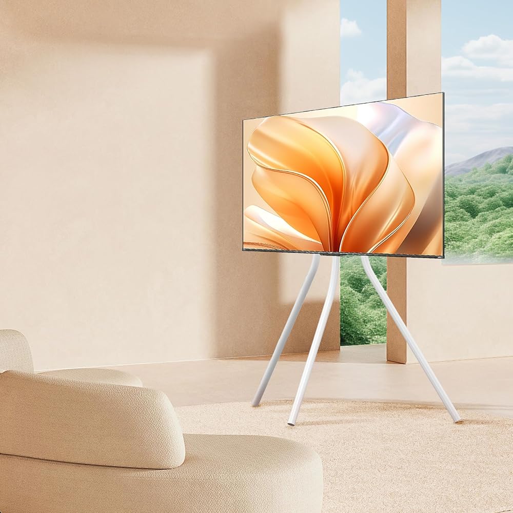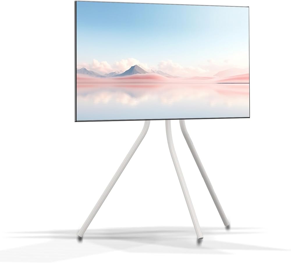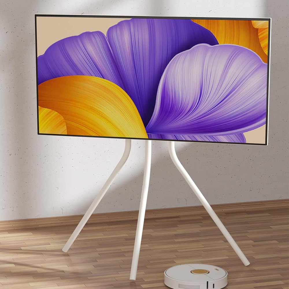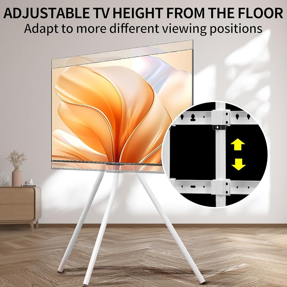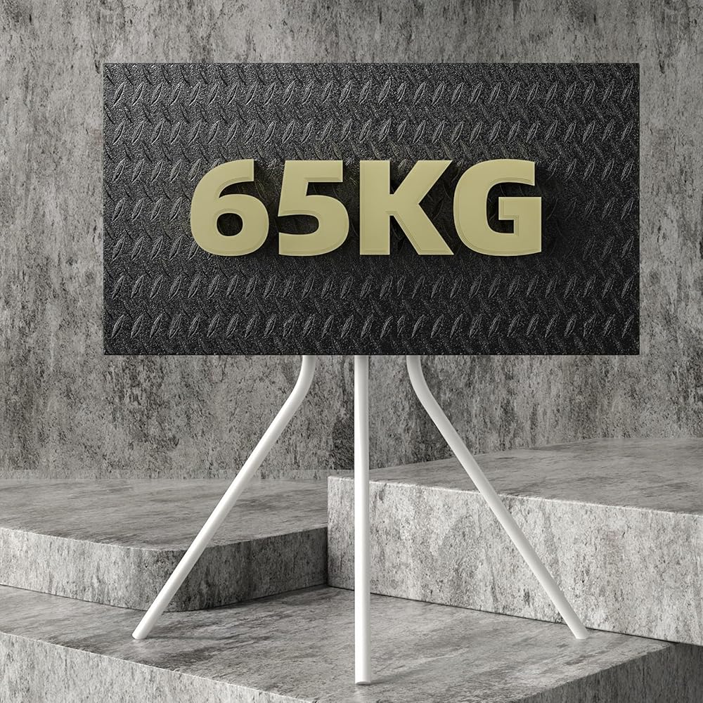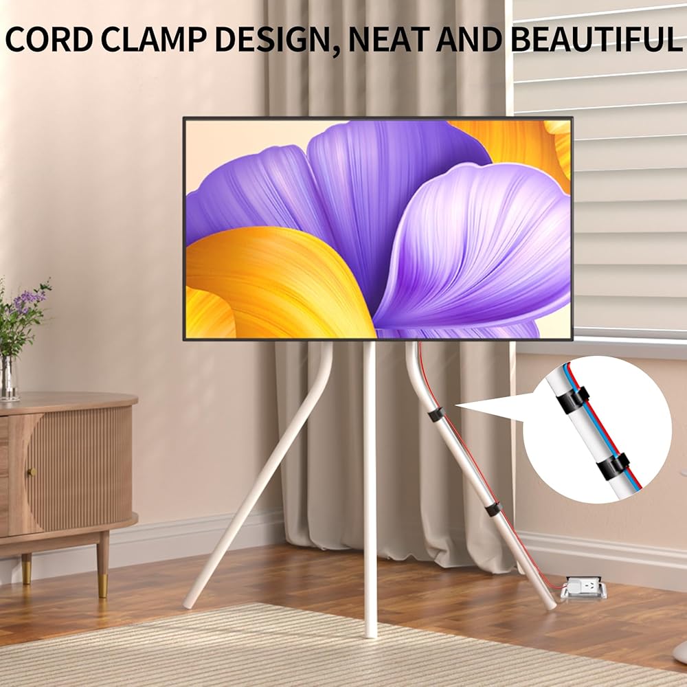 حامل تلفزيون حامل أبيض مع قاعدة حامل ثلاثي القوائم للشاشات المسطحة مقاس 42-86 بوصة، حامل ثلاثي القوائم لشاشة LCD LED قابل للتعديل للارتفاع لغرفة المعيشة مع روابط الكابلات، أقصى سعة تحميل 143.3 رطل YS613W