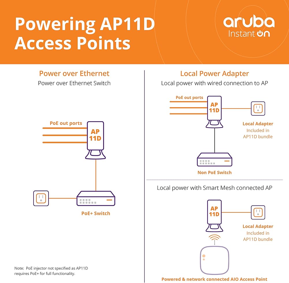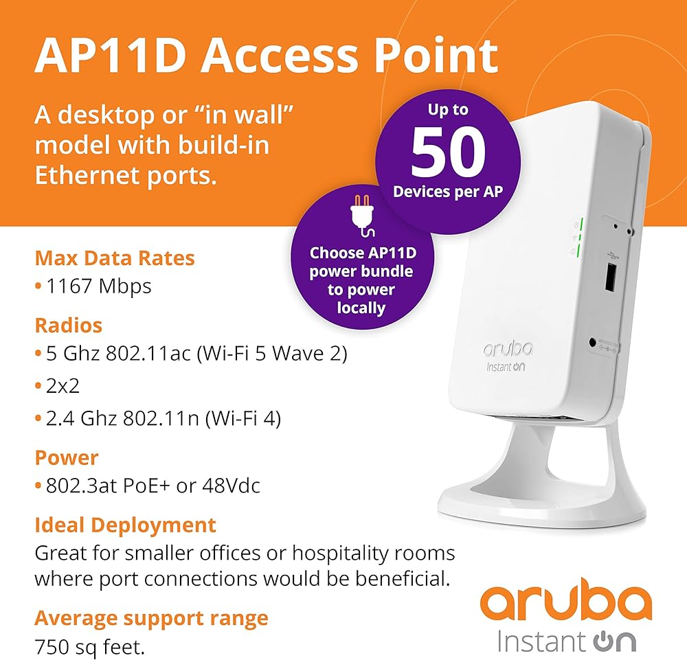 نقطة وصول فورية للشبكات من HPE AP11D 2x2 WiFi 5 نقطة وصول لاسلكية داخلية مع وصلة علوية و3 منافذ محلية | مصدر الطاقة متضمن | الموديل الأمريكي (R3J25A)