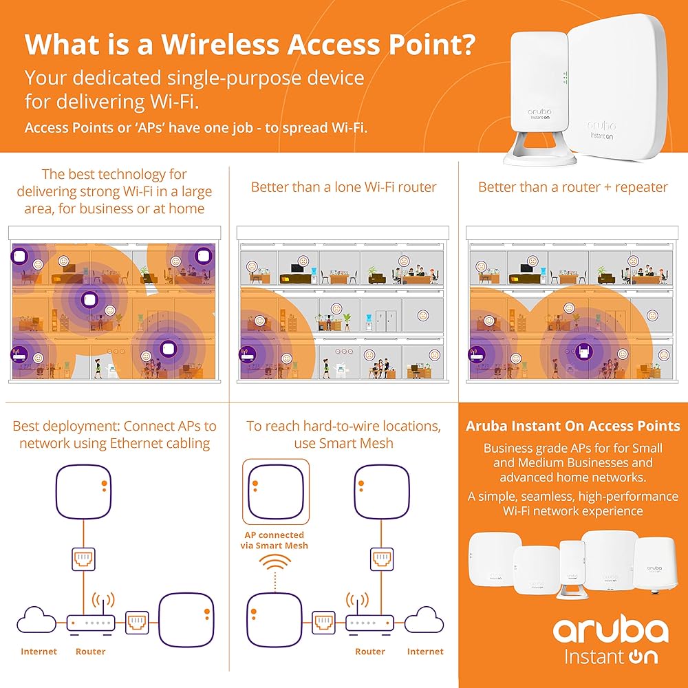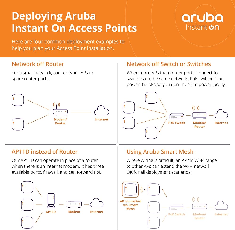 • توفر نقطة الوصول المكتبية/الحائط Instant On AP11D شبكة Wi-Fi Wave 2 802.11ac بسعر مناسب للأعمال لبيئات الأعمال الصغيرة منخفضة إلى متوسطة الكثافة. إنه الخيار الأمثل لتوفير اتصال Wi-Fi داخل الغرف في المكاتب ومواقع الضيافة مثل غرف الضيوف في الفنادق والعيادات الطبية وAirbnb الموجودة في نفس المبنى الذي توجد به شبكتك الرئيسية. ضمان رائد في الصناعة لمدة عامين وبدون رسوم ترخيص إضافية