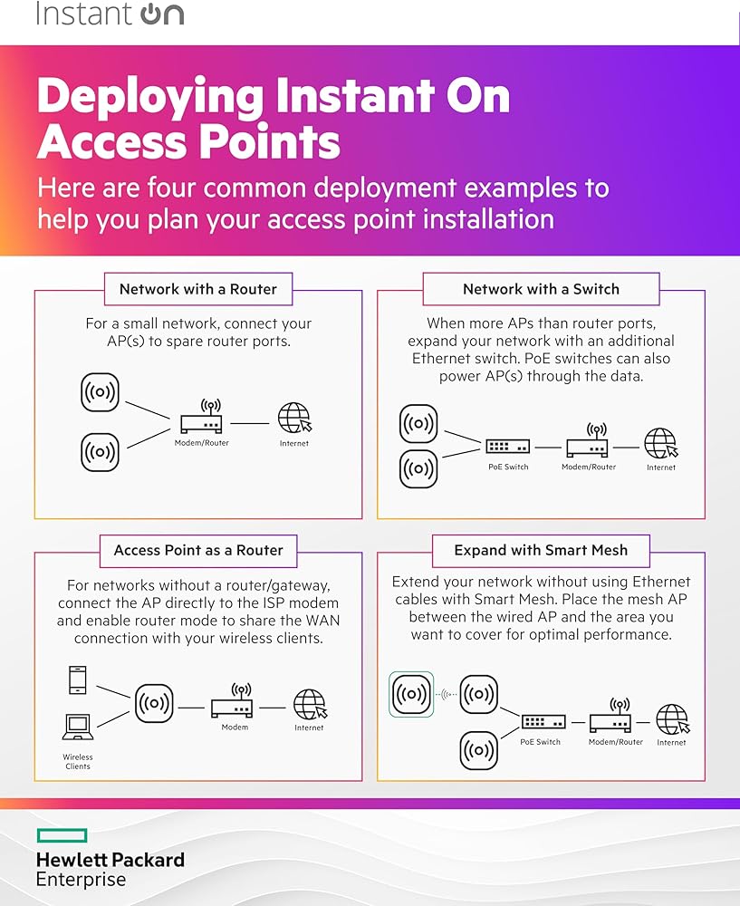 • سهولة الإعداد والإدارة: احصل على الإعداد والتشغيل في دقائق معدودة باستخدام تطبيق Instant On للهاتف المحمول أو نظام إدارة بوابة الويب. تعمل واجهة الويب وتطبيقات الهاتف المحمول المستضافة على السحابة على تسهيل إدارة العديد من نقاط الوصول الفورية المنتشرة في منشأتك، مما يحافظ على اتساق تسجيلات الدخول إلى الشبكة وإعدادات الأمان