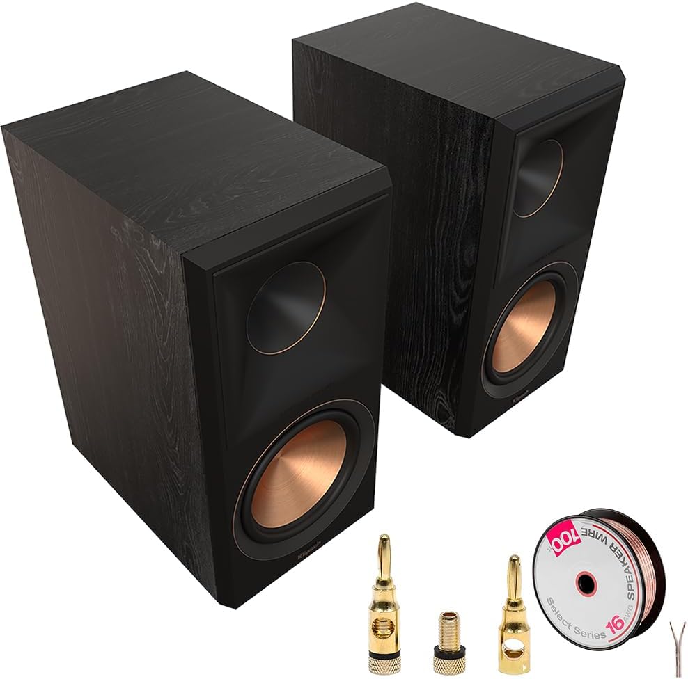 مكبرات صوت على رف الكتب من Klipsch RP-600M II - حزمة من خشب الأبنوس (زوج) مع سلك مكبر صوت Deco Gear بطول 100 قدم و16 AWG + مقابس مكبر صوت نحاسية، 5 أزواج