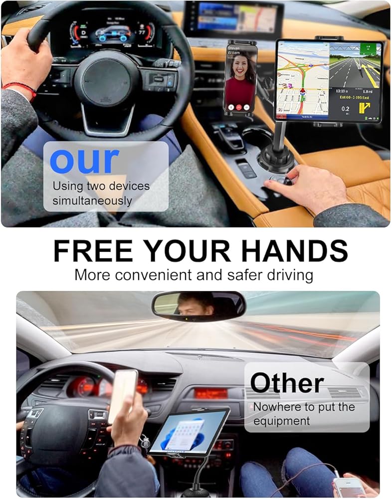 Car cup holder dual tablet phone holder with metal adjustment arm can rotate 360° very suitable for drivers to use two devices at the same time to make your travel more convenient and safer. Especially suitable for truck long-distance drivers who need to use multiple devices. The co-pilot can also use it at the same time