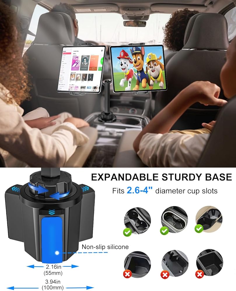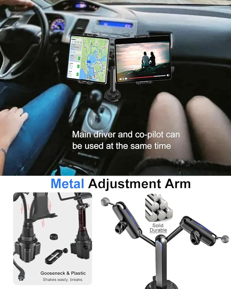 【Universal & Compatibility】:This universal Dual Car Tablet Mount for Cup Holder perfectly fits the cup holder of cars, trucks, Tesla, SUV, car back seat, treadmill, golf cart, boat, massage chair