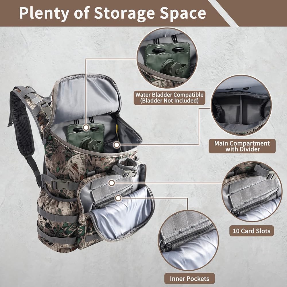 • سعة كبيرة: توفر حقيبة الظهر Huntit H3 للصيد سعة 37 لترًا، وتزن 3.52 رطل (2.12 كجم)، ويبلغ مقاسها 15.59 × 13.58 × 6.06 بوصة. تحتوي حجرة رئيسية كبيرة في حقيبة الصيد Huntit H3 هذه على معدات أكبر بشكل آمن، ومقسم مقصورة داخلي قابل للإزالة متضمنة. جيوب جانبية كبيرة مزدوجة تحمل نظارتك الشمسية أو مشروباتك أو الوسائط أو غيرها من العناصر التي يمكنك الوصول إليها بشكل متكرر. جيب أمامي للملحقات مزود بـ 10 فتحات لبطاقات SD لتخزين الأساسيات التي يمكن الوصول إليها بسرعة.