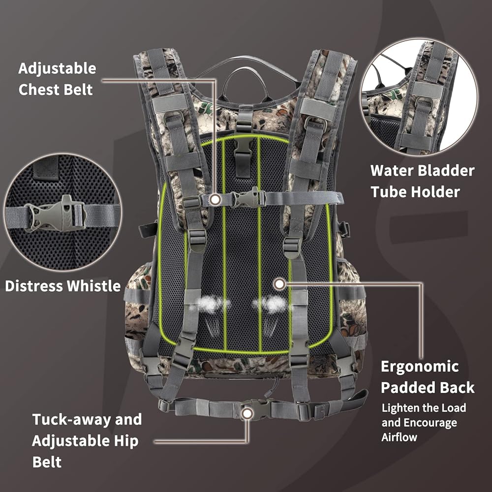 • مريحة ومريحة: تتميز حقيبة الظهر للصيد هذه بأحزمة كتف مبطنة وحزام للصدر قابل للتعديل للمساعدة في تحمل الحمل. تعمل اللوحة الخلفية المسامية على زيادة تدفق الهواء إلى الحد الأقصى حتى تظل باردًا أثناء الصيد في بداية الموسم. نظام حزام مخفي لحمل أحزمة الكتف/الخصر/الشجرة عند استخدامها على حامل الشجرة.