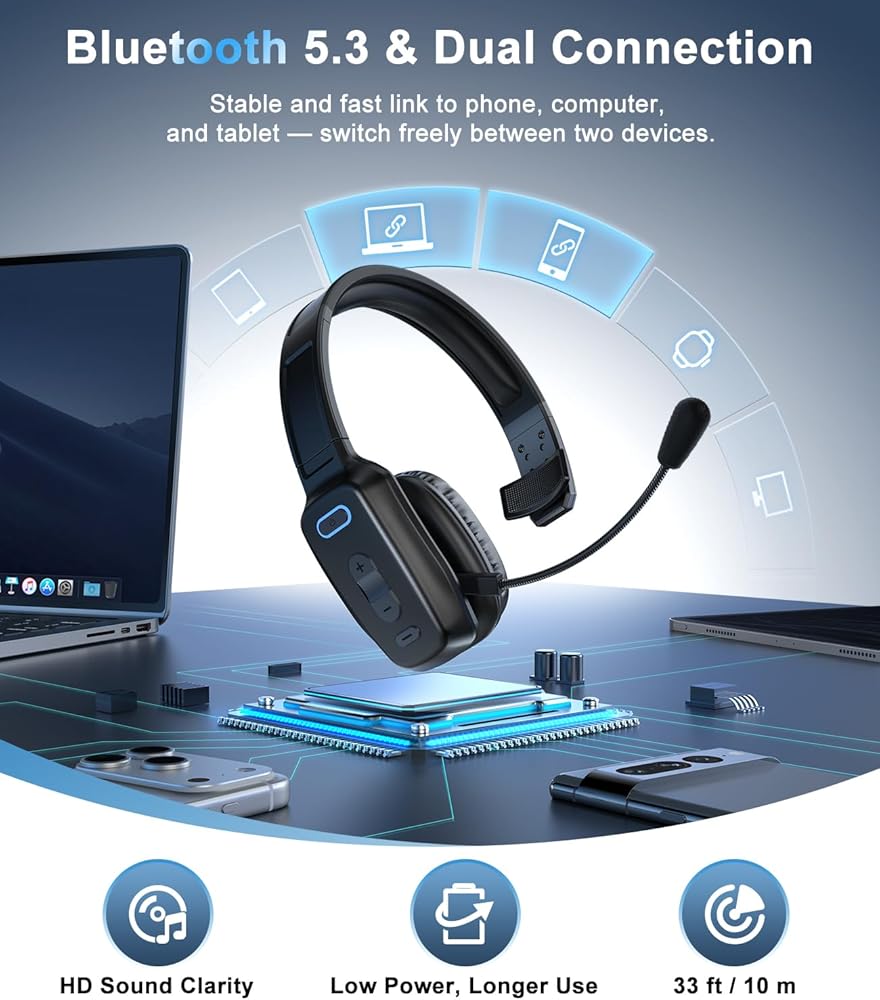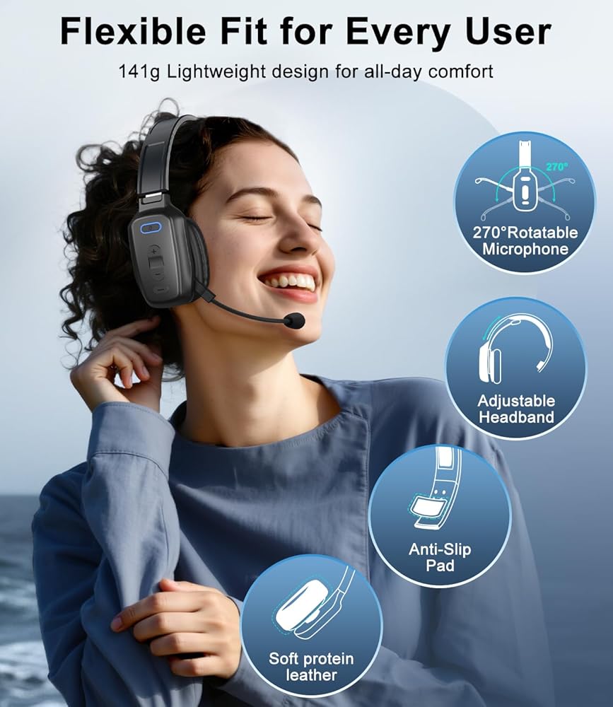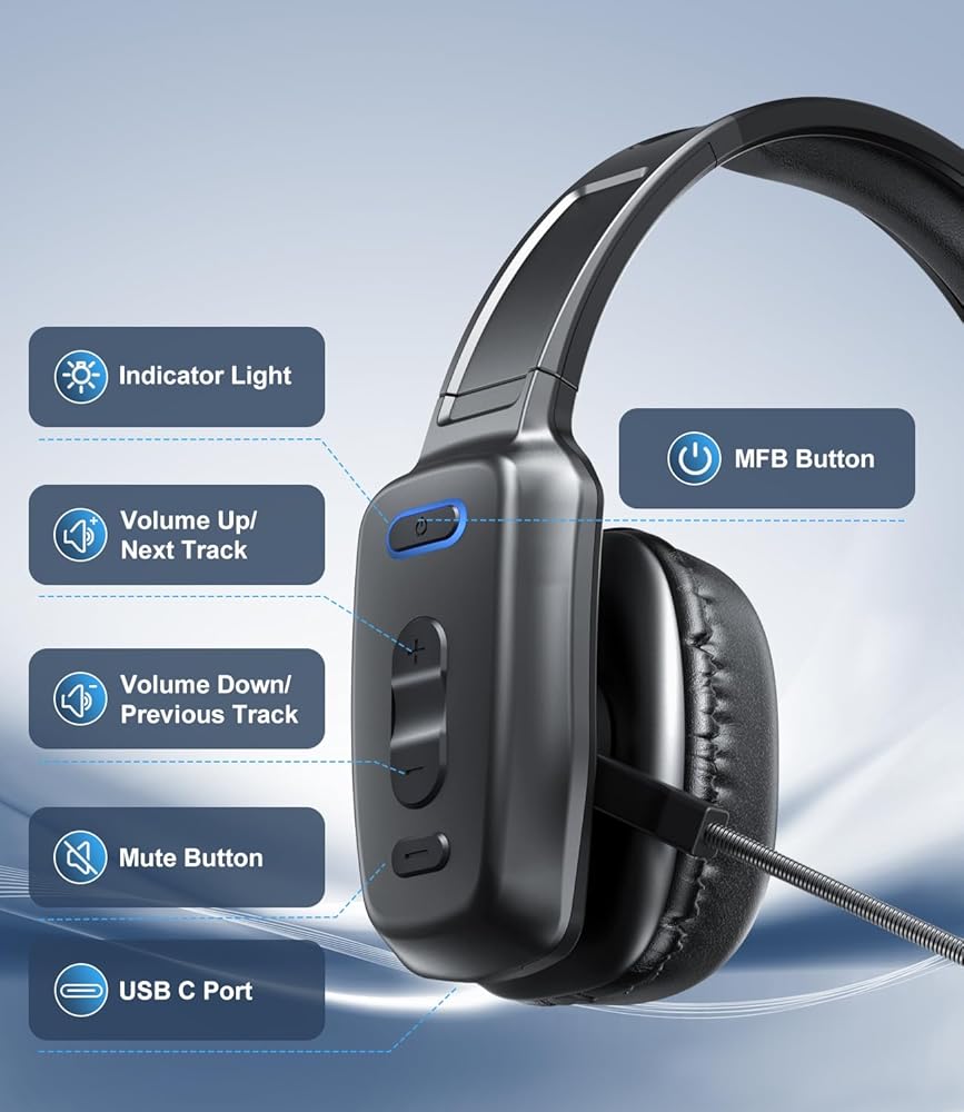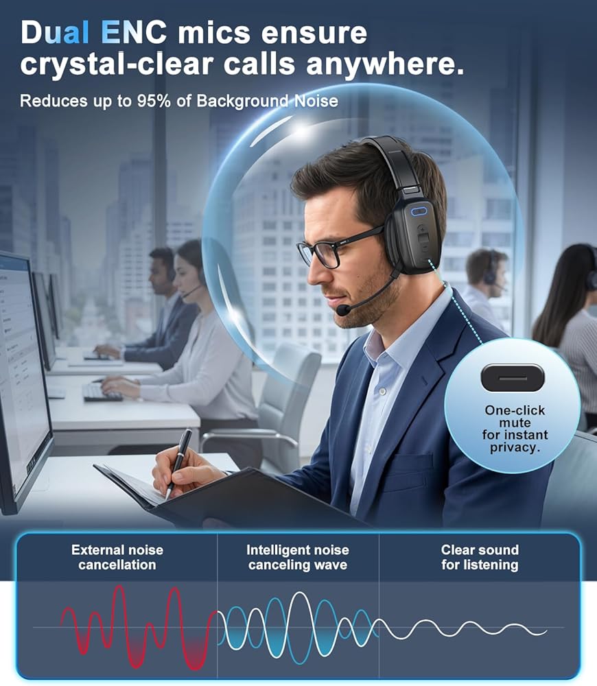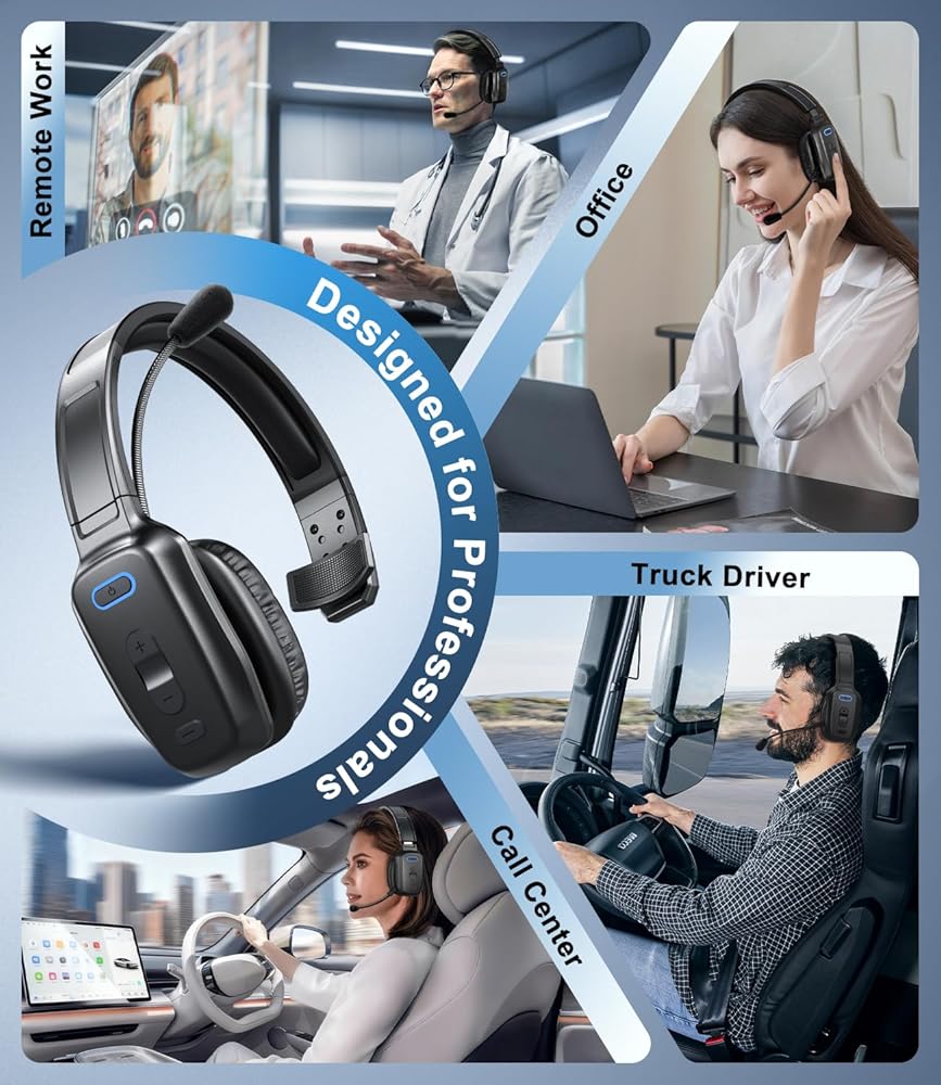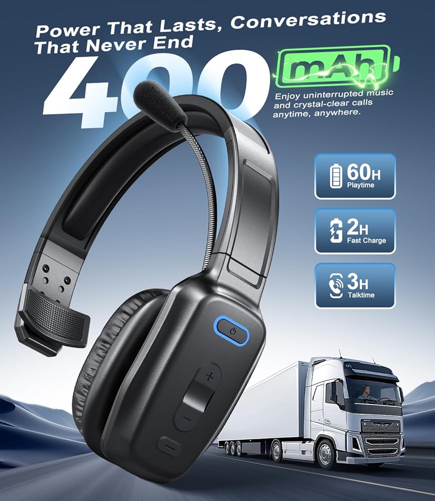 سماعة رأس بلوتوث، سماعة رأس لاسلكية لسائقي الشاحنات مع ميكروفون لإلغاء الضوضاء، سماعة رأس لسائق الشاحنة للعمل في مكتب الهاتف المحمول