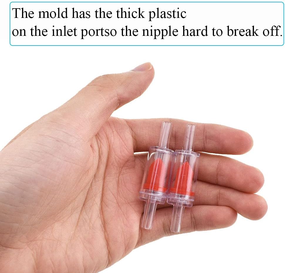 Material:made of transparent plastic,beautiful and durable.Packing specification: 6 Black check valves,each weighing 0.1oz/2.8g.The mold has the thick plastic on the inlet port so the nipple hard to break off.