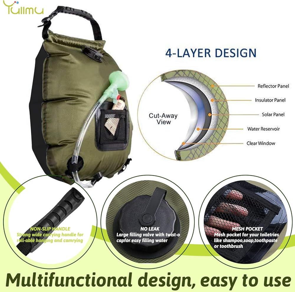 【حقيبة استحمام محمولة تعمل بالطاقة الشمسية】مع حقيبة الاستحمام المحمولة هذه، تسخن المياه الموجودة في الحقيبة حتى 113 درجة فهرنهايت (45 درجة مئوية) في غضون 3 ساعات تحت أشعة الشمس المباشرة. خفيفة للغاية وقابلة للطي، وسهلة الحمل والتخزين