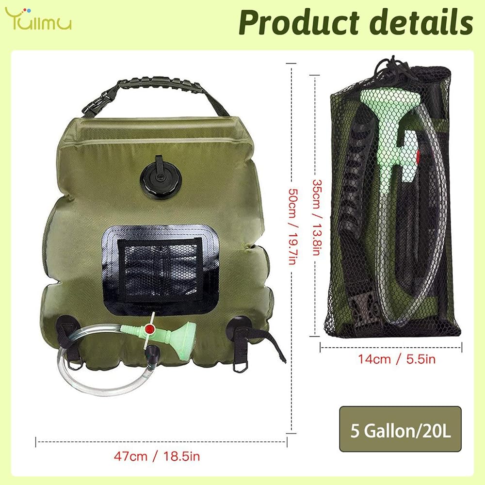 حقيبة دش محمولة للتخييم سعة 5 جالون/20 لتر مع خرطوم قابل للإزالة ورأس دش قابل للتبديل عند التشغيل والإيقاف، دش للسفر للسباحة على الشاطئ والمشي لمسافات طويلة