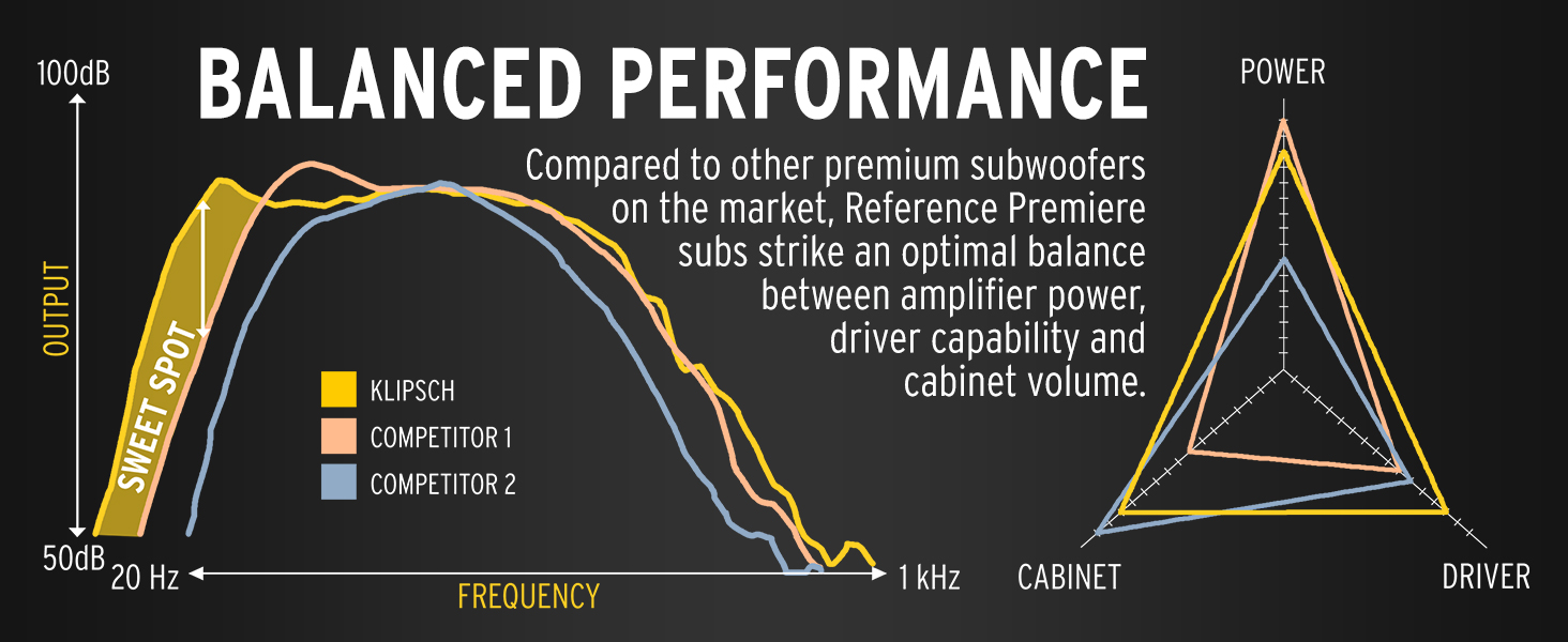 • صوتيات متقدمة: تم تصميم مكبرات الصوت الفرعية الجديدة عالية الأداء من Klipsch، والتي تستحق لقب العرض الأول المرجعي، باستخدام التكنولوجيا الصوتية الرائدة لدينا، وهي من أفضل مكبرات الصوت التي ابتكرتها Klipsch على الإطلاق.