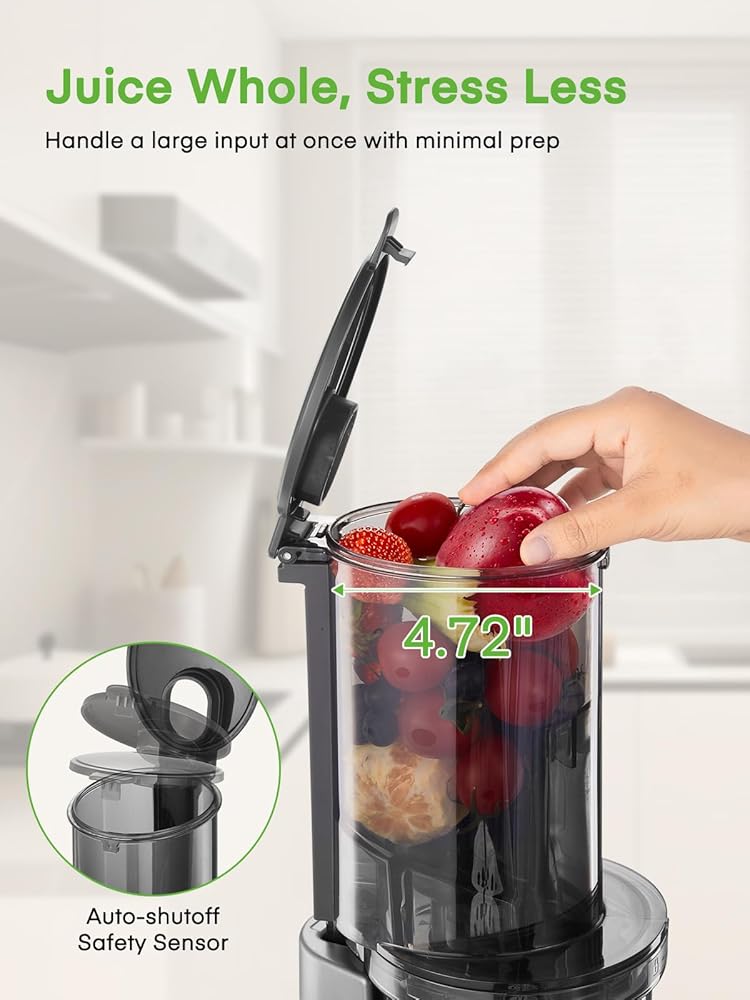 تحضير أقل وأكثر أمانًا: يقلل أنبوب التغذية الذي يبلغ عرضه 4.72 بوصة لهذه العصارة من الحاجة إلى التقطيع المسبق على نطاق واسع، مما يجعل عملية العصير أسرع وأكثر ملاءمة وهو مثالي للصباح المزدحم. يمكنها استيعاب تفاحة كاملة أو خضروات كبيرة دون تقطيعها مسبقًا، مما يوفر الوقت. تعمل آلية الإغلاق التلقائي على إيقاف العصارة عند فتح الغطاء، مما يمنع الإصابات العرضية ويحمي سلامتك.