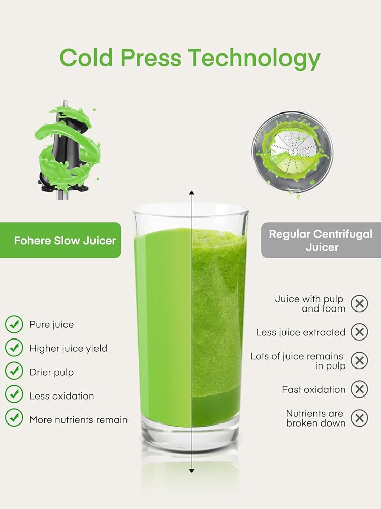 تقنية الضغط البارد: تستخدم العصارة تقنية مضغ منخفضة السرعة لا تحافظ على العناصر الغذائية والإنزيمات فحسب، بل تولد أيضًا كمية رائعة من العصير. إن إنتاجية العصير أكبر بكثير من إنتاج عصارة الطرد المركزي العادية. يكون اللب جافًا بشكل استثنائي، مما يشير إلى أن الآلة تستخرج أكبر قدر ممكن من العصير من المنتج.