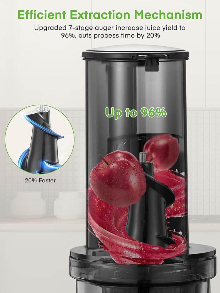 أكسدة أقل، عصير نقي: تضمن عصارة المثقاب المتقدمة المكونة من 7 مراحل أقصى قدر من الاستخلاص من الفواكه والخضروات من خلال عملية سحق وضغط دقيقة متعددة الخطوات. بفضل تحقيق عائد عصير يصل إلى 96% عند عصر التفاح، فإنه يقلل وقت المعالجة بنسبة 20% مقارنة بالعصارات البطيئة التقليدية. تحافظ هذه الطريقة أيضًا على العناصر الغذائية الأساسية، مما يسهل امتصاصها من قبل الجسم.