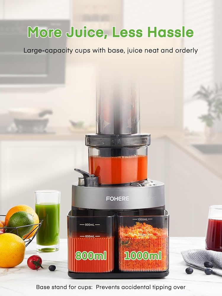 سعة كبيرة: تتميز هذه العصارة بكوب عصير بسعة 800 مل، مما يسمح باستخلاص المزيد من العصير دفعة واحدة، مما يقلل من الوقت الذي تقضيه في التفريغ. مع حاوية اللب سعة 1000 مل، من الممكن إجراء جلسات عصر متواصلة أطول حيث يمكن أن تتراكم المزيد من اللب قبل الحاجة إلى التفريغ. علاوة على ذلك، تأتي العصارة مع قاعدة متينة لأكواب العصير وحاوية اللب، مما يساعد على منع الانقلاب العرضي، مما يضمن بقاء كل شيء منظمًا.