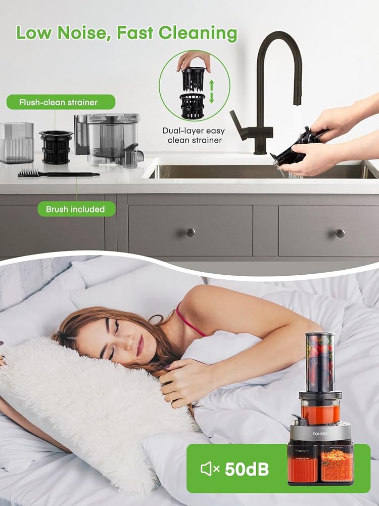 سهلة التنظيف وآمنة للاستخدام: تم تصميم هذه العصارة البطيئة لتوفير الراحة؛ يمكن تفكيك كل مكون بسرعة، مما يضمن تجربة تنظيف خالية من المتاعب. يمكن فصل الفلتر مزدوج الطبقات إلى جزأين ولا يحتوي على شبكة، مما يجعل تنظيفه وصيانته أسهل من الفلاتر العادية بشطف الماء البسيط. مجهزة بقفل أمان، لن تعمل العصارة إلا إذا تم تشغيل القادوس وغرفة العصير بشكل صحيح، مما يضمن تجربة عصر آمنة.