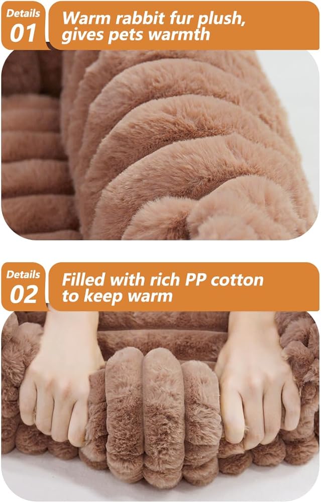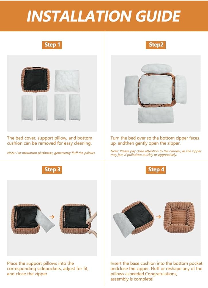When you open the packaging of the pet bed, you will find that it has been compressed and does not match the picture.But you don't have to worry.Just take the PP cotton filler out and wash the cover by hand or in the washing machine, then sun the PP cotton filler with natural light, so that it returns to the full shape as shown in the picture, shake it, leave it for 1-2 days, because it is soft polyester filler, there is a lot of stuffing, will make the dog or cat bed more fluffy.