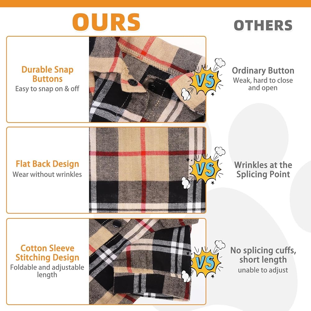 خياطة طية الصدر والأساور: الياقة والأساور مصنوعة من مادة قطنية، والتي يمكن قلبها لأسفل أو طيها لضبط طول الأكمام بشكل أفضل. التصميم المرقعة يجعل القميص أكثر عصرية وفريدة من نوعها. الحافة المرتفعة للبطن تسهل تبول الحيوانات الأليفة ولا تخنق المعدة.