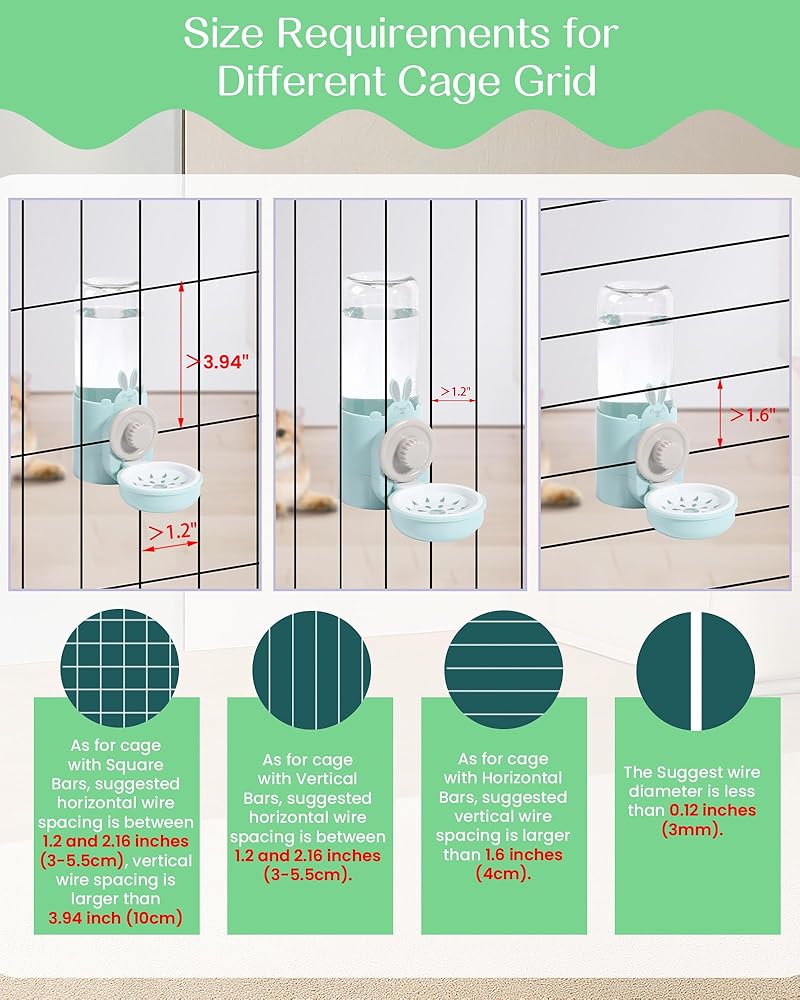 • [Suggest Tips] The size of pet waterwe is 7.9x3x6.3". Please check your cage spacing before purchasing, the cage wire is recommended to be spaced between 3-5.5cm(1.2-2.2"). By the way, please do not wash the dispenser in hot water.
