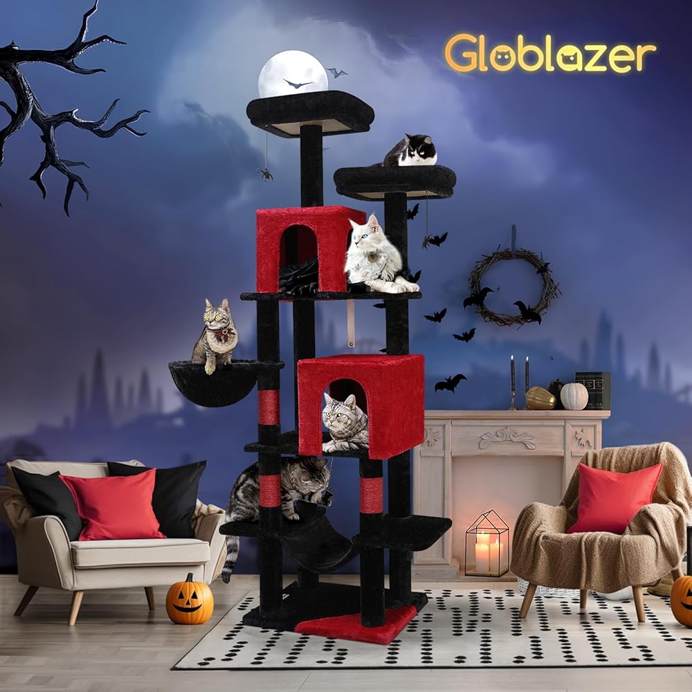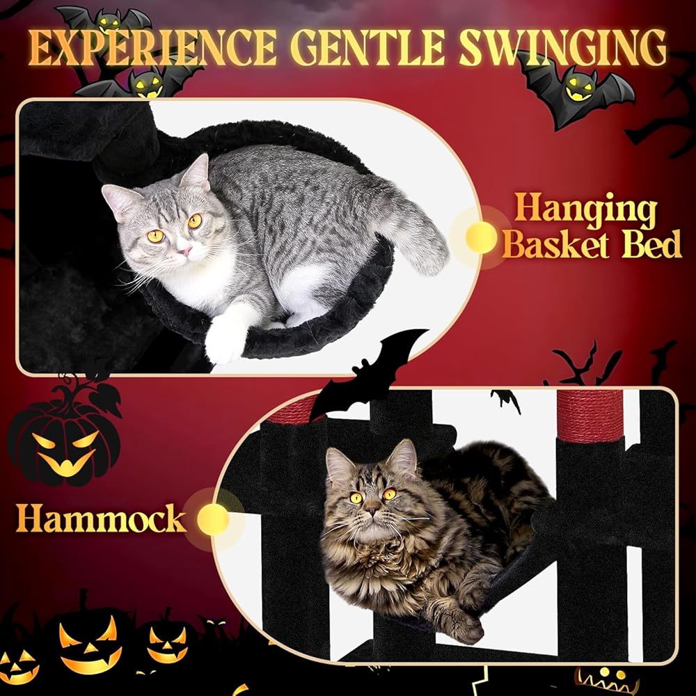 F69 شجرة القط القوطية، 69 بوصة شجرة القط القوطية طويل القامة للقطط الداخلية الكبار الكبار، برج شجرة القط الأحمر والأسود، برج القط الهالوين مع عمود الخدش، أرجوحة، 2 شقق قطط، 2 مجثم علوي