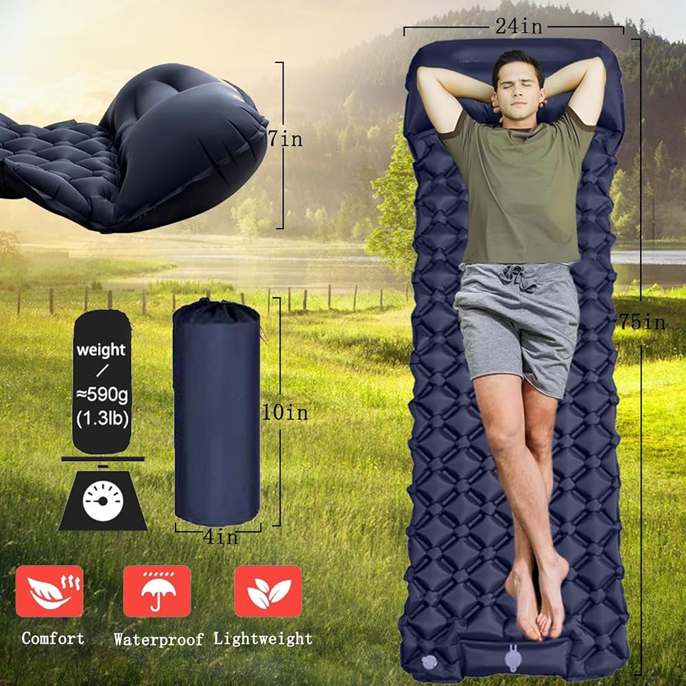 【خفيفة الوزن ومحمولة وسهلة التخزين】 تزن وسادة التخييم خفيفة الوزن 1.4 كجم فقط، وهي بحجم زجاجة مياه فقط عند تفريغها من الهواء وطيها، فقط 10*4*4 بوصات. توفر لك وسادة مرتبة التخييم هذه المزودة بوسادة مدمجة أيضًا عناء حمل وسادة إضافية. يمكن وضع وسادة النوم الخاصة بنا على الظهر بسهولة في حقيبة الظهر الخاصة بك واصطحابها معك. مثالية للمشي لمسافات طويلة والتخييم وحقائب الظهر والسفر والتسلق والمشي لمسافات طويلة وغيرها من الأنشطة الخارجية.