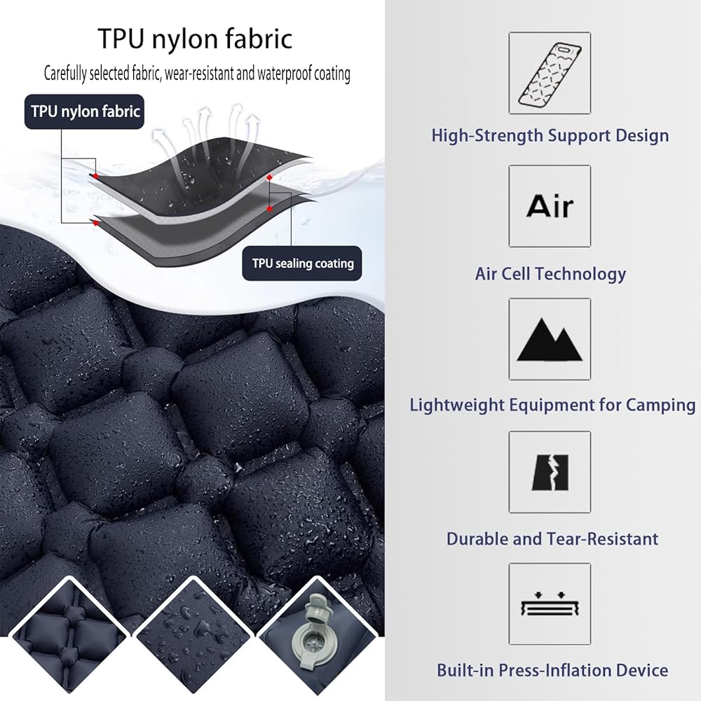 【مواد عالية الجودة وصناعة متقنة】 وسادة النوم الخاصة بنا للتخييم مصنوعة من مادة من الدرجة الخارجية، نسيج نايلون 40D مقاوم للماء وطلاء داخلي من مادة TPU، متين، لا يتمزق وسهل التنظيف. تتيح لك مرتبة التخييم ذات التصميم المريح النوم بشكل سليم حتى في البيئات الخارجية القاسية. خضعت مرتبة التخييم القابلة للنفخ هذه لفحص صارم للجودة، لذا يرجى استخدامها بثقة.