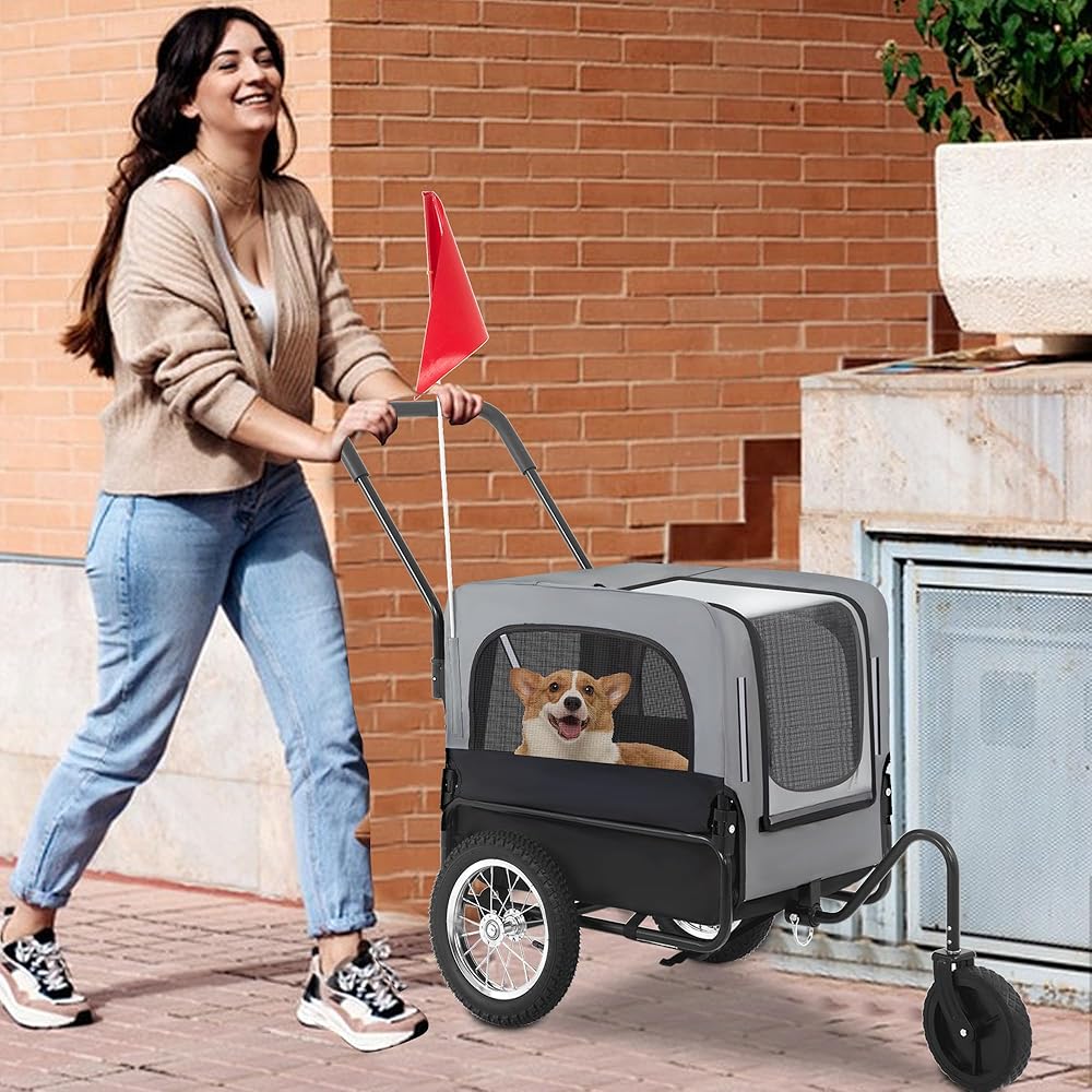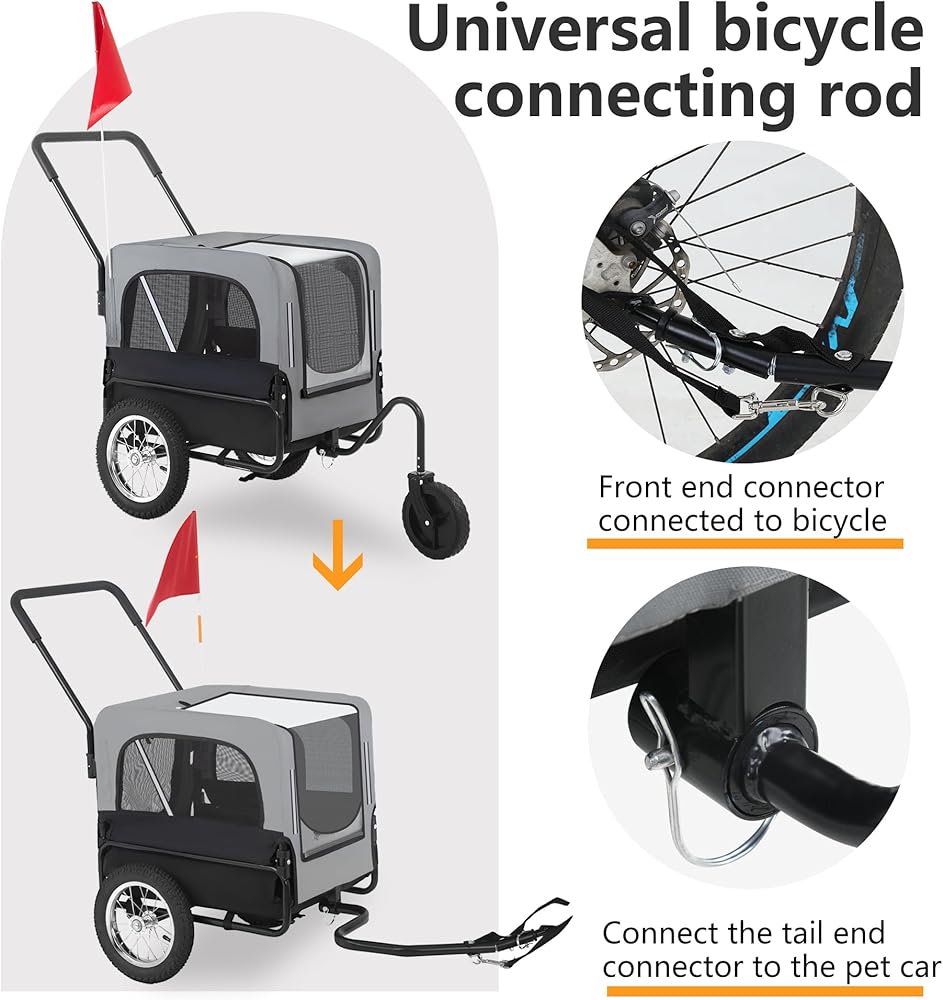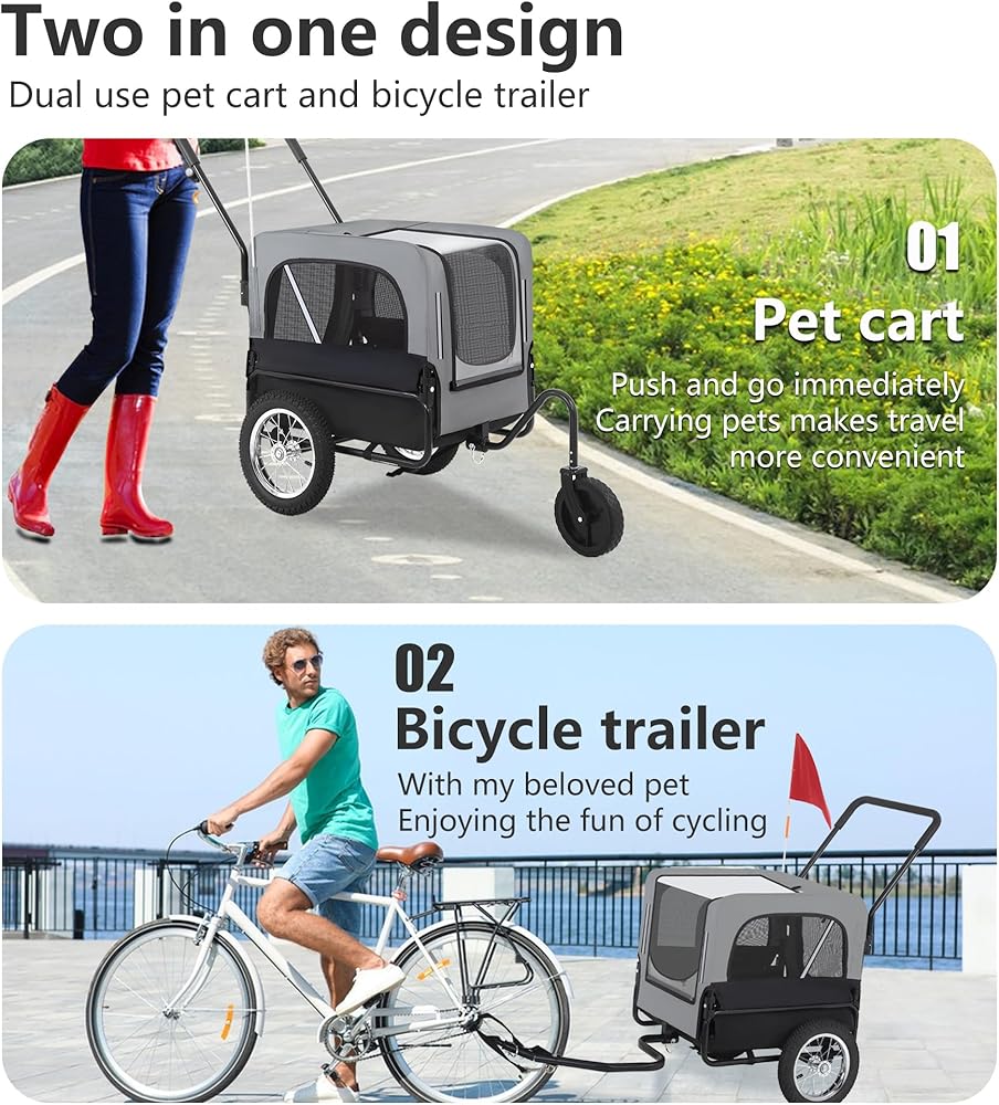 Two-in-One Design: An adaptable option for pet transportation, this pet stroller's attachment doubles as a bicycle trailer and pet cart. It is simple to switch between modes to fit your journey, whether you are riding a bike or taking a stroll in a park. dog stroller pet stroller dog bike trailer