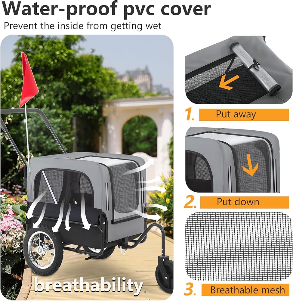 Water-proof PVC Cover: The dog stroller's cover offers superior protection against rain and moisture thanks to its high-quality, water-resistant PVC construction.This ensures that your pet remains dry and comfortable, regardless of the weather conditions, making it ideal fir all-season use. dog stroller pet stroller dog bike trailer