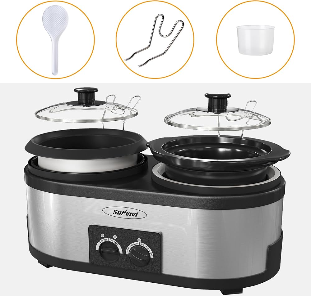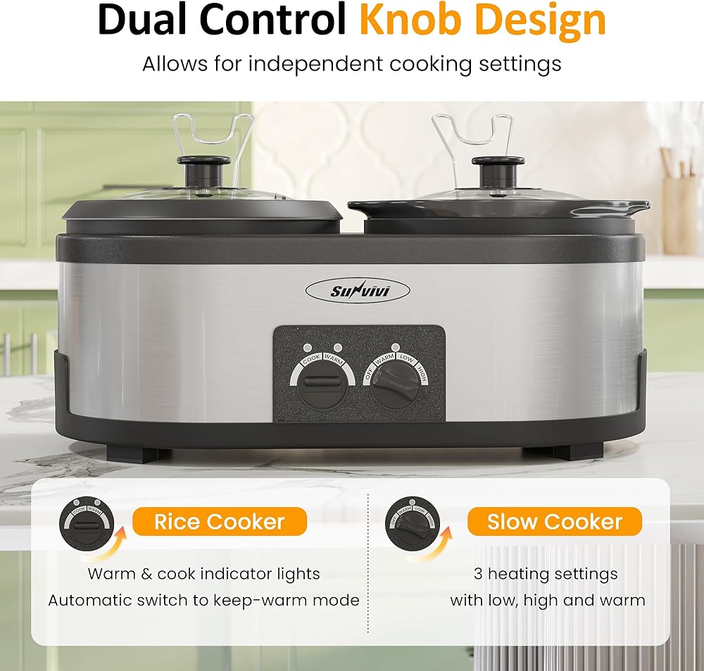 تصميم 2 في 1: استمتع بتجربة الراحة التي يوفرها جهاز الطهي البطيء وجهاز طهي الأرز 2 في 1، مما يسمح بالطهي المتزامن وطهي الأرز للحصول على وجبات موفرة للوقت. يتعامل جهاز طهي الأرز مع الأرز والعصيدة والحساء وأكثر من ذلك، بينما يتفوق جهاز الطبخ البطيء في الخبز والطهي والحفاظ على الأطباق دافئة.