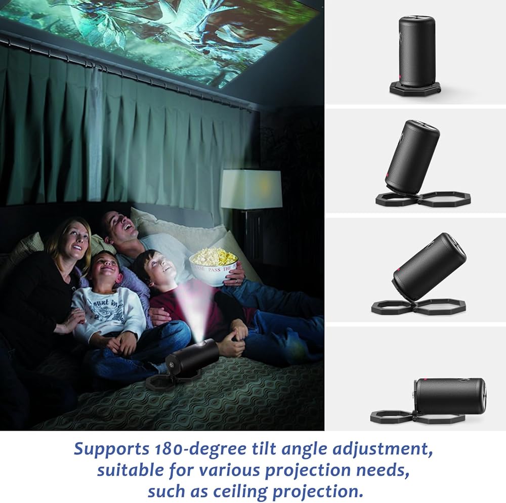 • Adjustable Viewing Angle: Supports 180-degree tilt angle adjustment, suitable for various projection needs, such as ceiling projection, allowing you to fully control your entertainment experience.