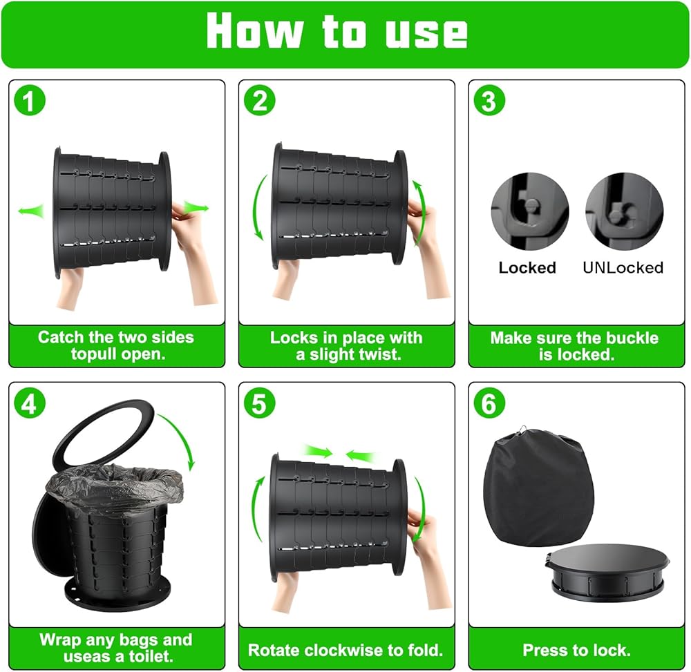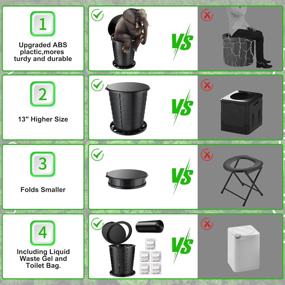 🏕️【مريح ومتين】المرحاض القابل للطي الذي تم ترقيته حديثًا مصنوع من بلاستيك ABS القوي والذي يتميز بأنه قوي ومريح بشكل مدهش بمجرد تركيبه. فقط امسحها بالماء لجعلها جيدة كالجديدة. استخدمه تمامًا مثل أي مرحاض تخييم محمول على شكل دلو. إذا كنت حريصًا على تجنب المرافق العامة أو تخطط للذهاب للتخييم بانتظام، فإن مرحاض المخيم الخاص بنا يعد خيارًا معقولاً. سيجعل استخدامك الكامل لمرحاض المخيم أكثر راحة. فهو يحمل ما يصل إلى 450 رطلاً، وهو مناسب لجميع أفراد الأسرة!