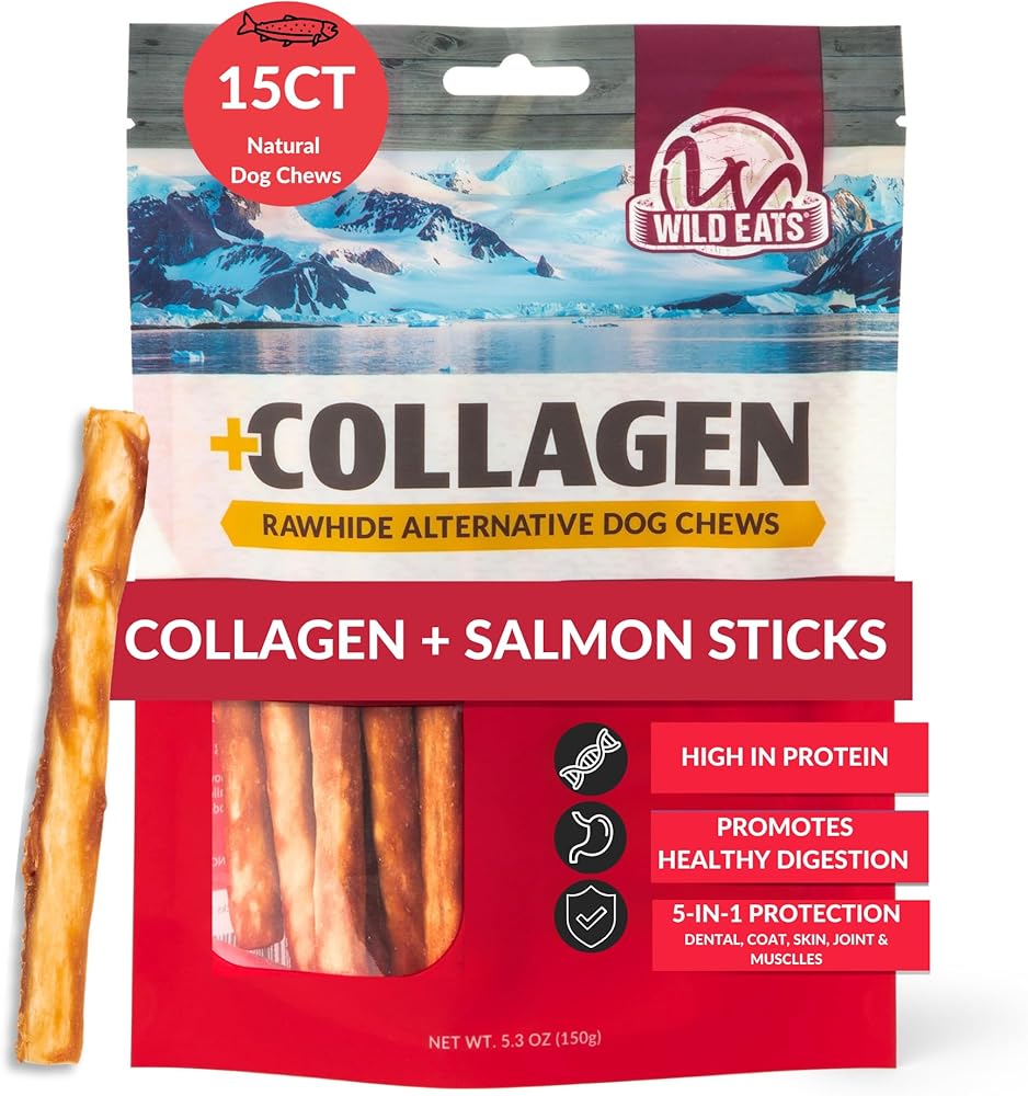 أعواد كولاجين السلمون للكلاب، (15 قيراط، سمك 1 سم) عصا صحية للفتوة - علاج مضغ للكلاب يدوم طويلاً