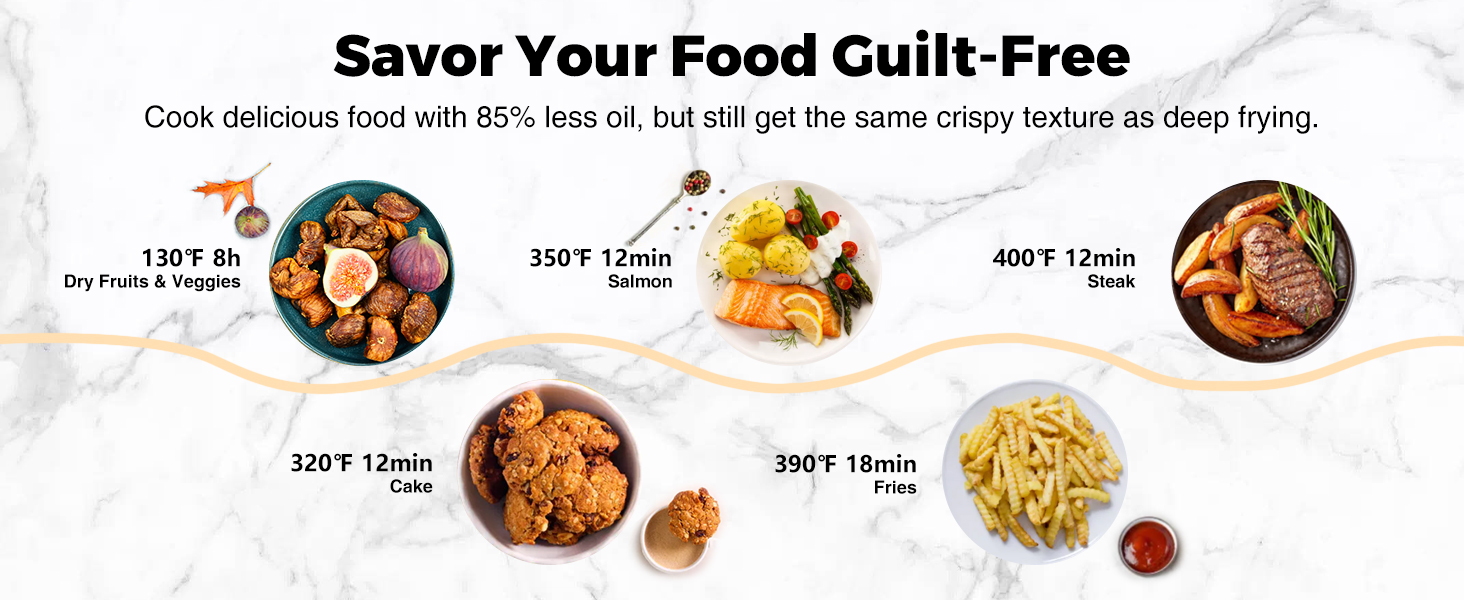 ▶𝗟𝗘𝗦𝗦 𝗢𝗜𝗟 & 𝗚𝗨𝗜𝗟𝗧-𝗙𝗥𝗘𝗘 𝗖𝗢𝗢𝗞𝗜𝗡𝗚 : استمتع بالأطعمة المقلية المفضلة لديك مع زيت أقل بنسبة 85% من المقالي العميقة التقليدية، بزاوية 360 درجة دوران الهواء السريع يحقق نفس المقرمشة اللذيذة دون الشعور بالذنب.