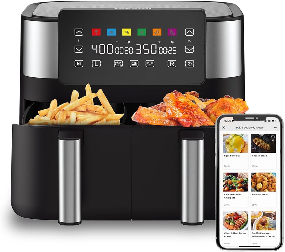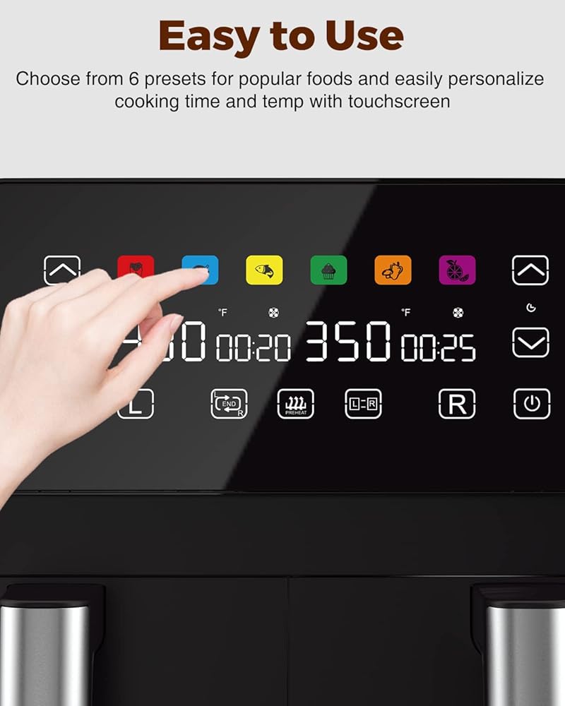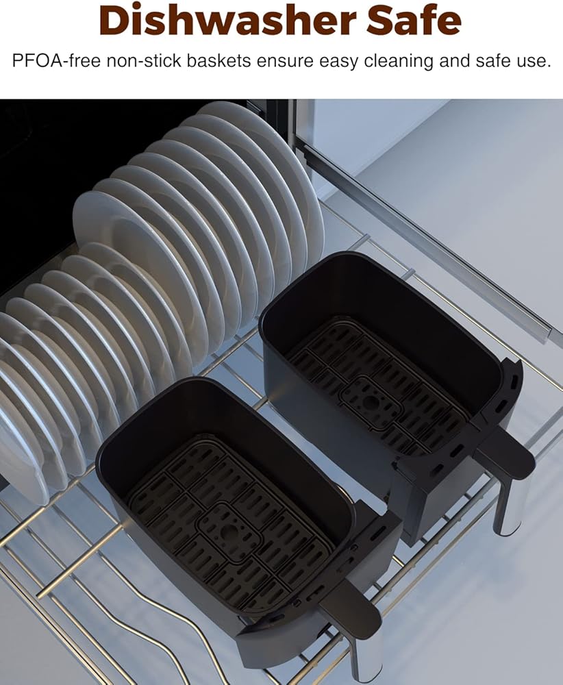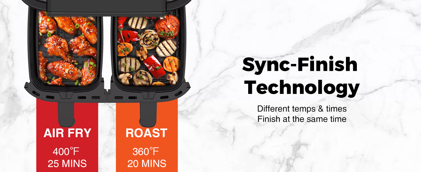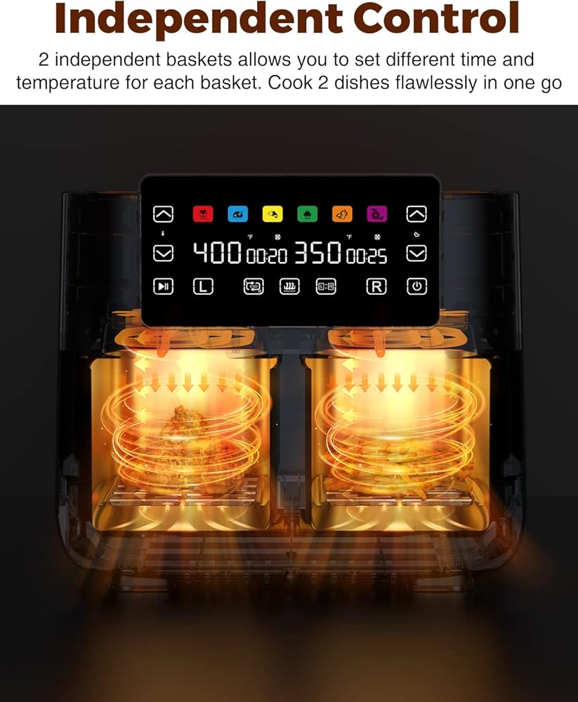 ► مقلاة هوائية مزدوجة من JOYAMI مع سلتين مستقلتين، تتيح لك طهي وجبتين، بطريقتين في نفس الوقت مع إعدادات وقت ودرجة حرارة مختلفة، وتجنب العودة إلى الوضع السابق -الطهي الخلفي مثل المقلاة الهوائية التقليدية ذات السلة الواحدة.