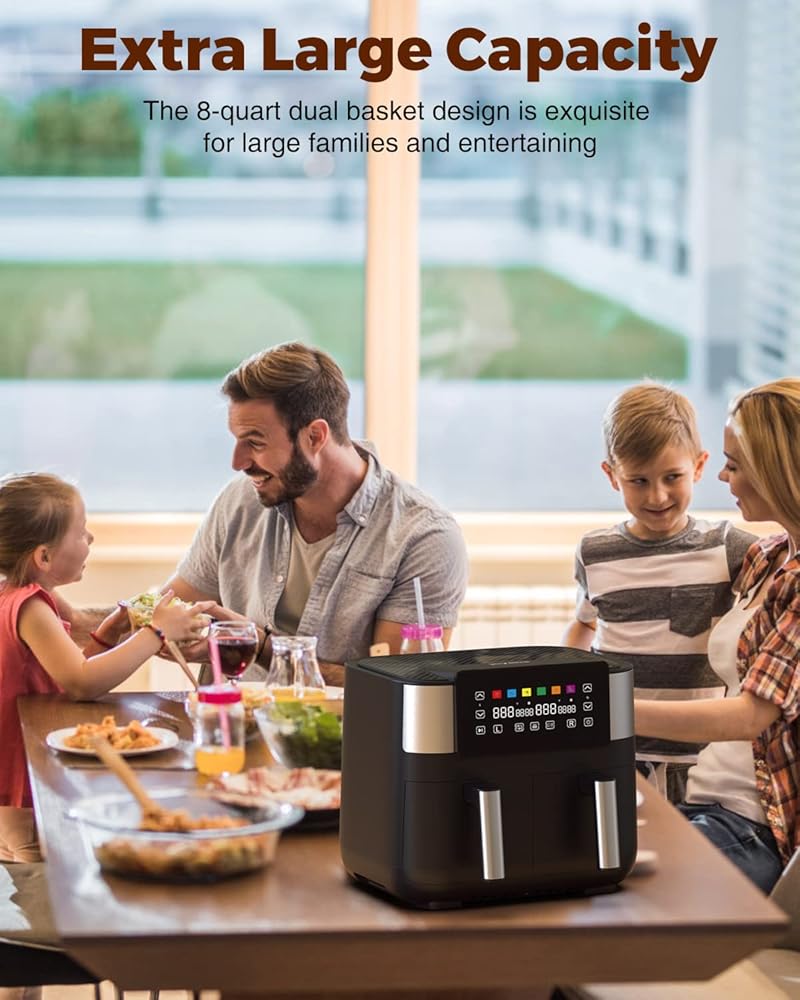 ◙𝗢𝗥 𝗪𝗛𝗢𝗟𝗘 𝗙𝗔𝗠𝗜𝗟𝗬 : سعة XL 8 لتر (سلال 2 × 4 لتر) تسمح لك بطهي ما يكفي من الطعام لجميع أفراد الأسرة، مما يجعل إعداد الوجبات أمرًا سهلاً.