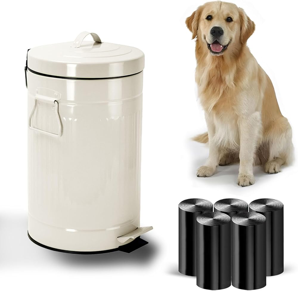 Uppcasir Dog Poop Trash Can Outside, 12L Dog Waste Trash Can with Lid, Foot Pedal, Inner Bucket, and 100 Dog Waste Bags, Round Outdoor Dog Poop Trash Can, Dog Waste Container for Garden, White