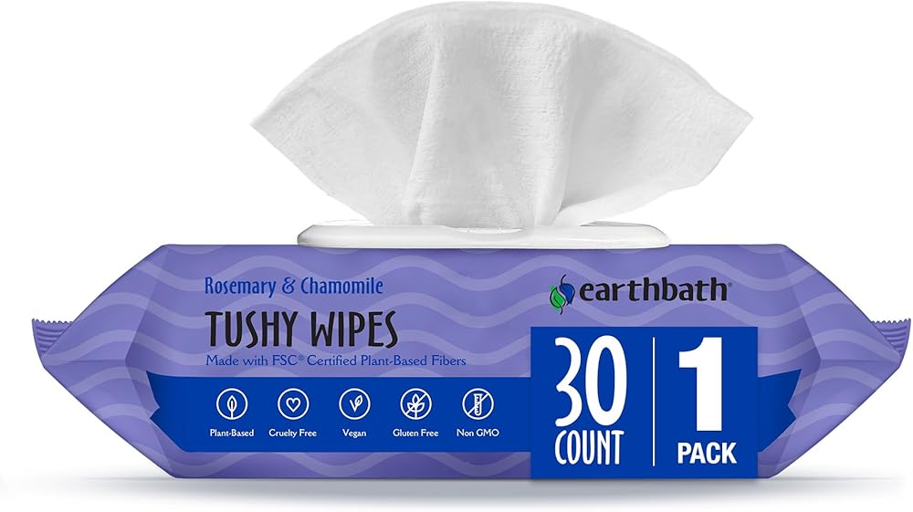 earthbath® Tushy Wipes offer a safe and convenient way to keep your pet's tush fresh, clean and odor free between baths. Gentle and non-irritating, these plant-based wipes are specially formulated to help neutralize unpleasant odors with rosemary oil, baking soda, and saccharomyces ferment (odor-eating enzymes). Mild cleansers remove stuck on mess and stains, while chamomile helps soothe the skin. They are the professional groomer's choice to express anal glands, which helps alleviate booty-dragging behavior (smile, you know the dance...). Safe for daily use on all animals over 6 weeks old. Helps neutralize odors Gentle & Non Irritating Alcohol & Paraben Free Made with  FSC® Certified plant-based fibers