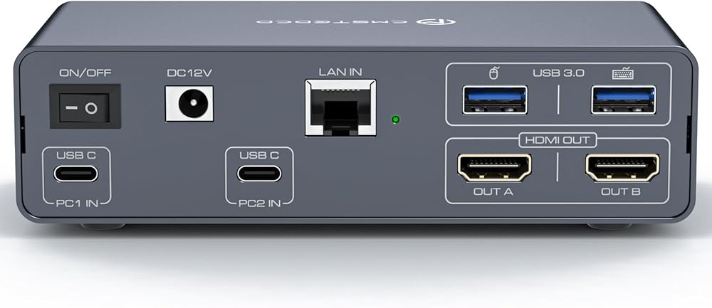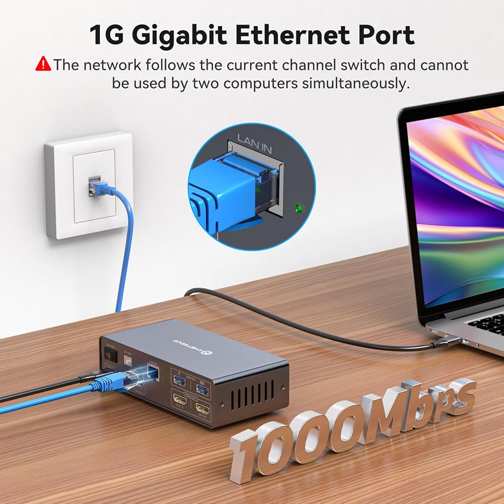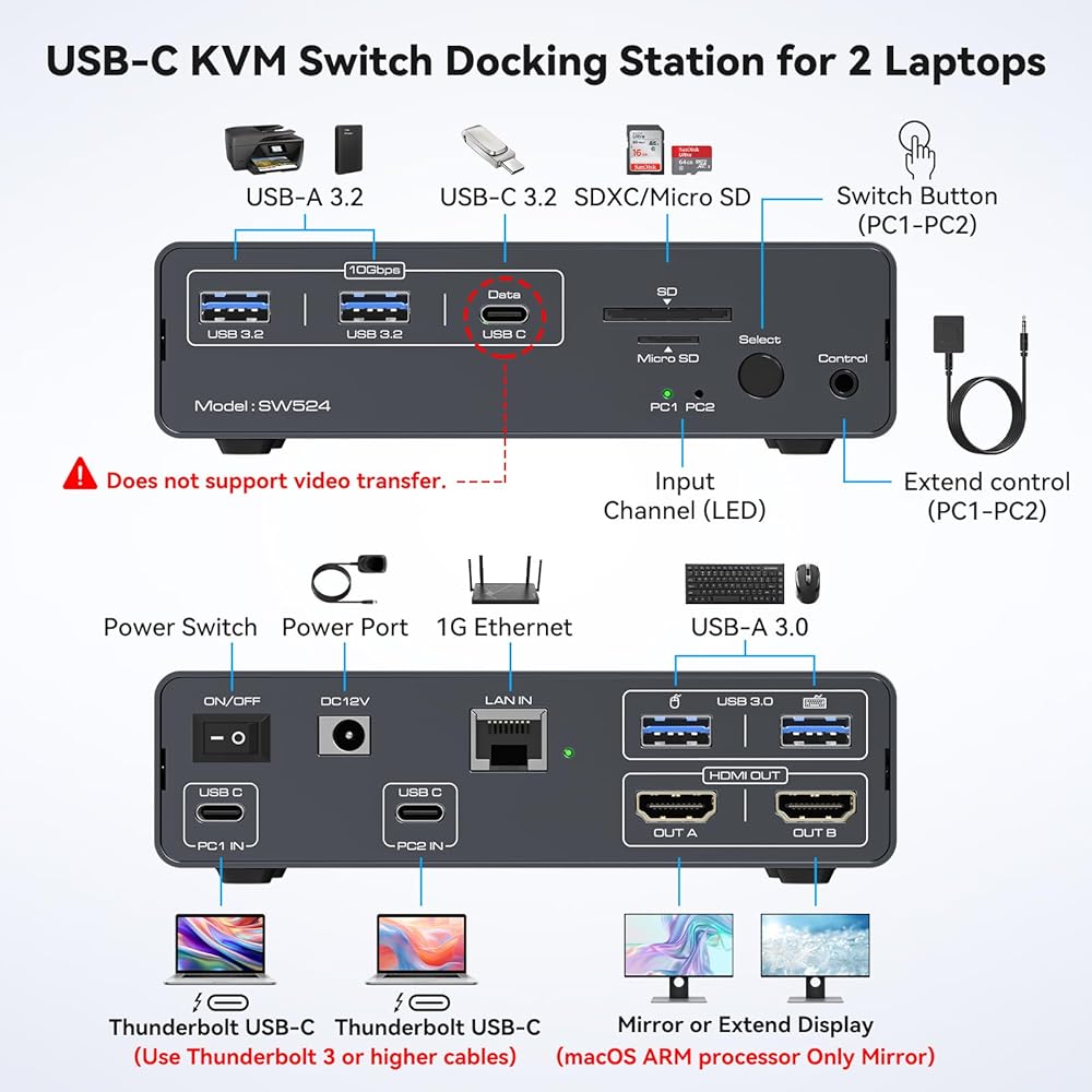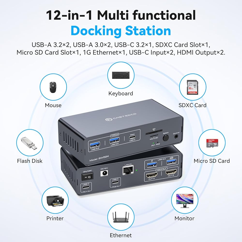 【12-in-1 Multifunction Dock】 Allows two laptops to share the following expansion ports: 2*5Gbps USB3.0, 1*1000Mbps Ethernet port, 2*4K60 HDMI Display, 2*10Gbps USB3.2, 1*10Gbps USB C , 1*SD, 1*microSD card. (Please note that two laptops cannot use the docking station at the same time.)
