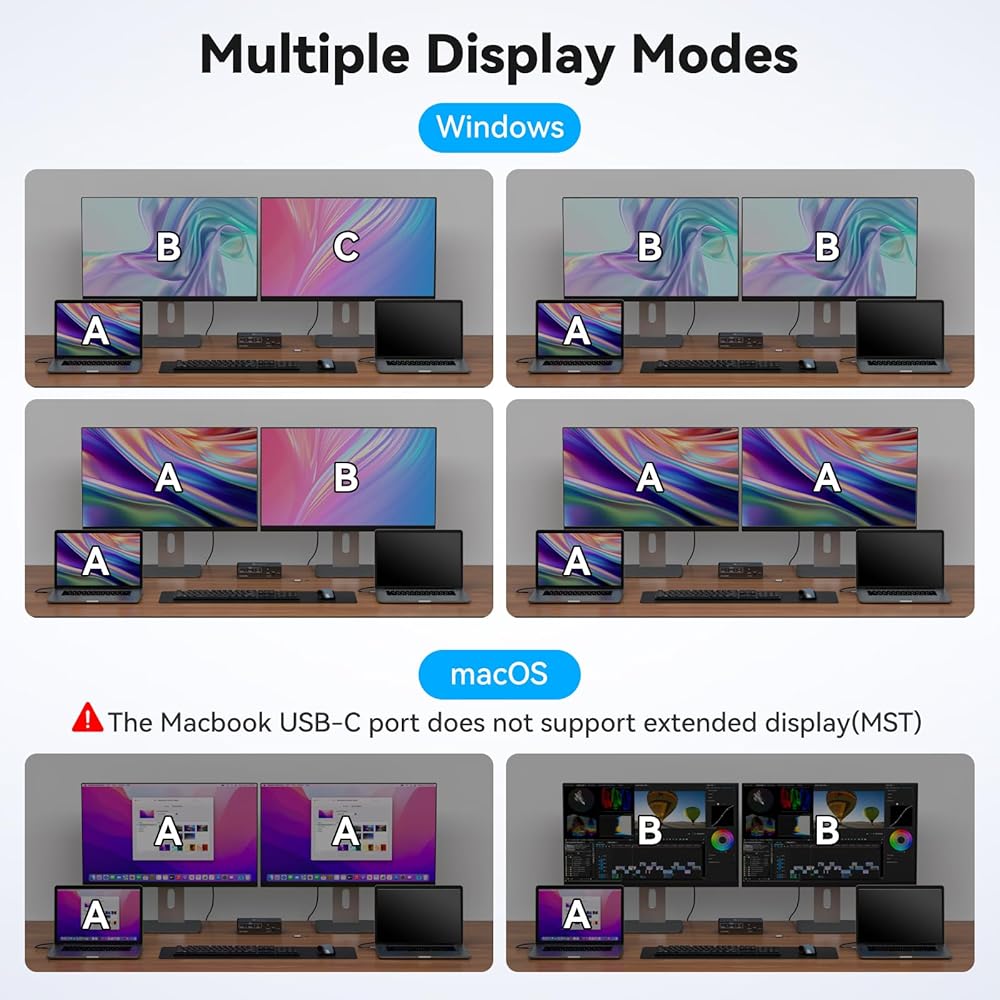 【Dual Monitor Docking Station】 For dual 4K60Hz supported displays, when a laptop transfers images to two HDMI displays via a USB-C port, the port must be compatible with the Thunderbolt 3/4 standard or have DP Alt Mode capability. Importantly, in Windows OS, SST and MST modes are available, while in macOS, it is limited to SST mode only