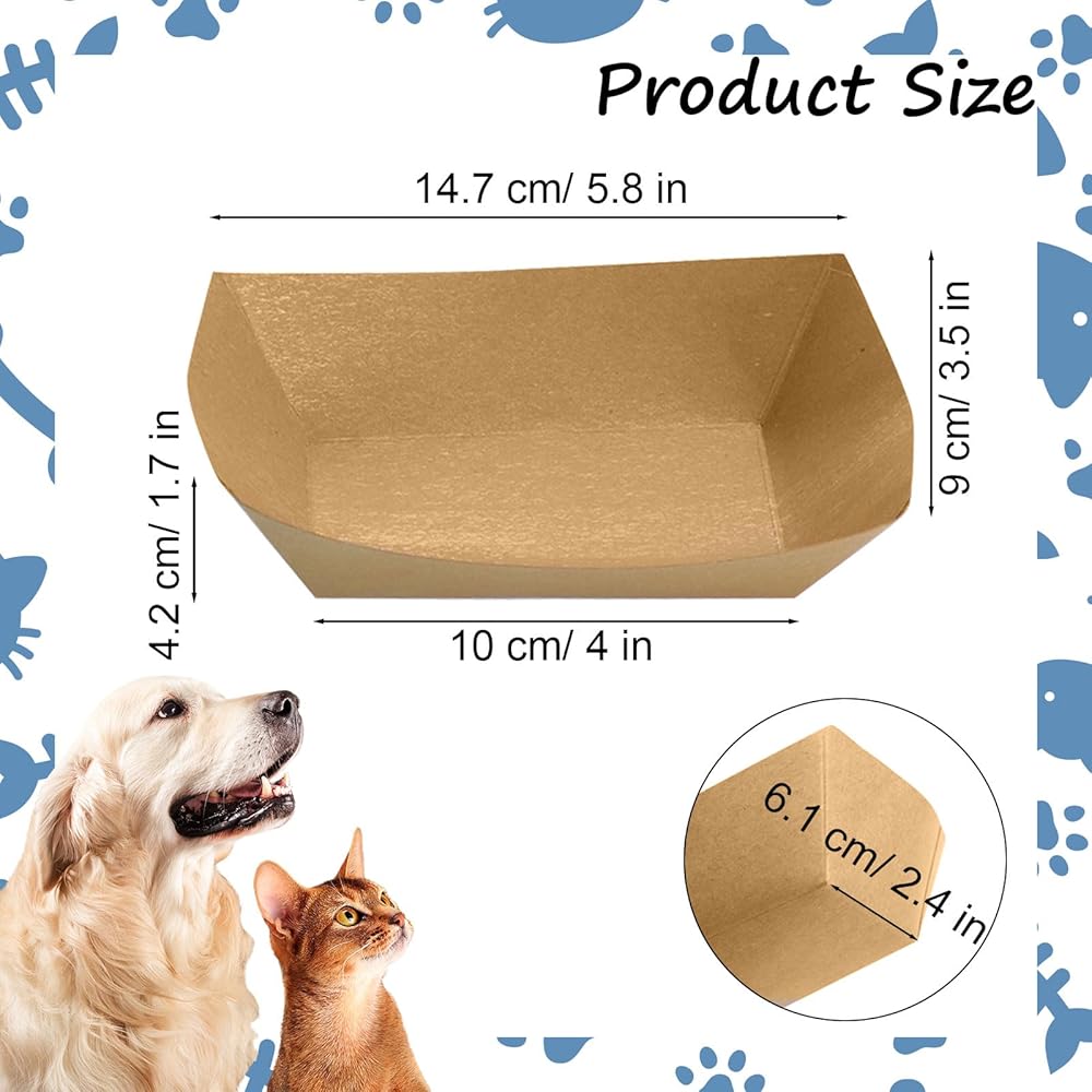 • APPLICABLE SIZE: The bottom of disposable pet food bowls small measures 6.9 inches/17 centimeters, the width of the bottom is about 4.33 inches/11 centimeters, and the height is about 2.63 inches/6.7 centimeters. small paper bowls for cat food openings measure 24 centimeters/9.44 inches in length. This size is very suitable for family pets to put food.