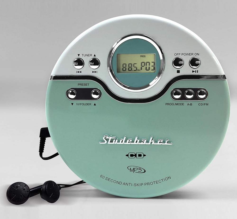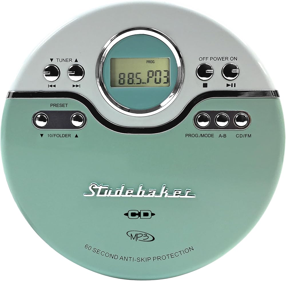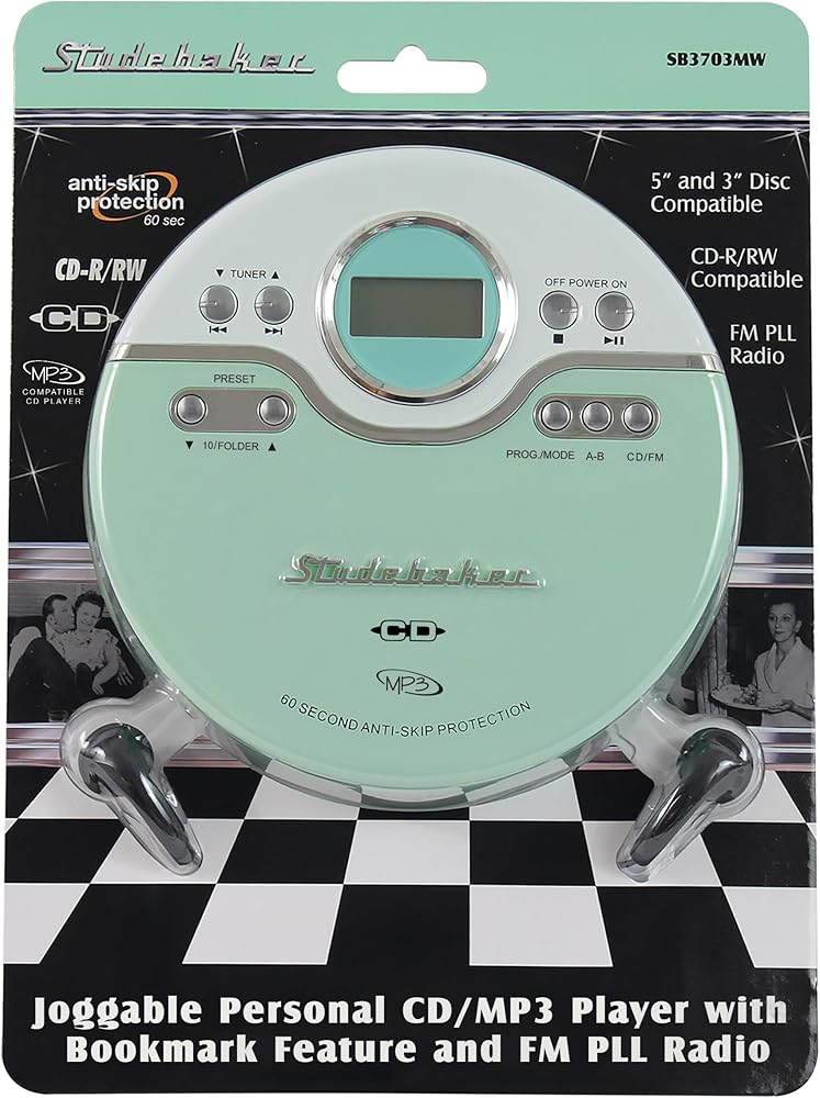 Studebaker SB3703MW Joggable Personal CD Player with FM PLL Radio includes Earbuds (Mint/White)Listen to your favorite tracks on the go with the Studebaker SB3703 personal CD player with FM radio. This compact, lightweight device comes in 3 colors. The CD player includes a headphone jack and earbuds. It features 60-second Anti-Skip protection, bass boost, digital LCD display, Skip/Search, Play/Pause, Repeat, and programmable memory. This player has a mini USB port so the unit can be powered through a computer or any other USB power source. Requires two (2) AA batteries for power (not included) for portable use.